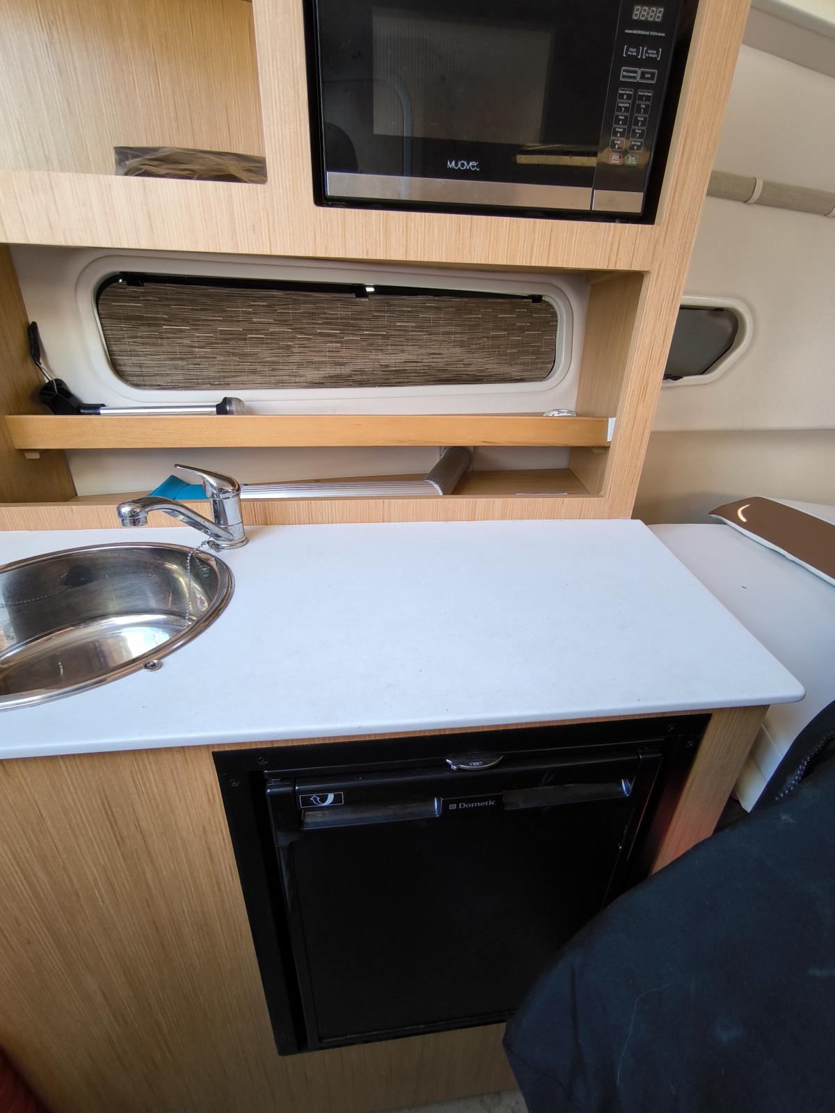 Cuisine équipée avec réfrigérateur, évier et plaques de cuisson pour des repas gourmands en mer.