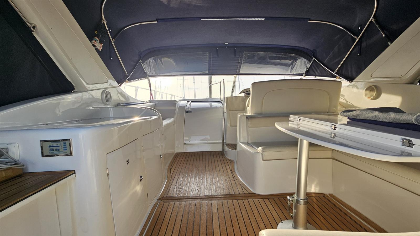 Douche de cockpit, Propulseur d'étrave (Vetus), Phare de poursuite, Flaps hydrauliques (N°2), Lavabo dans le cockpit, Passerelle (Idraulica), Plateforme arrière (di poppa con fondo in teak), Cockpit en teck, Connexion eau sous pression à quai, Rollbar, Guindeau électrique, table de cockpit.