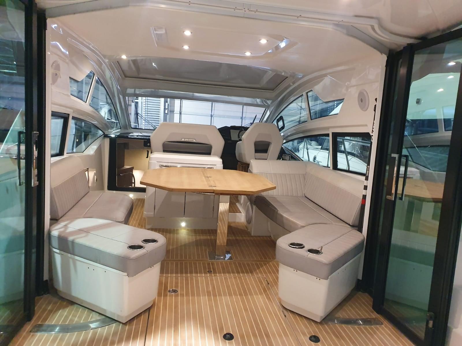 Avec ses lignes sportives et élégantes, la Gran Turismo 46 combine un toit rigide à ouverture totale, des vitres latérales électriques et une grande porte vitrée qui s’ouvre et permet d’isoler le cockpit. Combinaison parfaite d’ouverture et de protection, il offre deux accastillages de pont : la cuisine vers la poupe ou la cuisine dans le cockpit. La dernière génération de la coque planante offre pour la première fois le choix du moteur Volvo IPS 600. Sûr et parfaitement manœuvrable à la fois, ce modèle assure un grand plaisir de navigation.