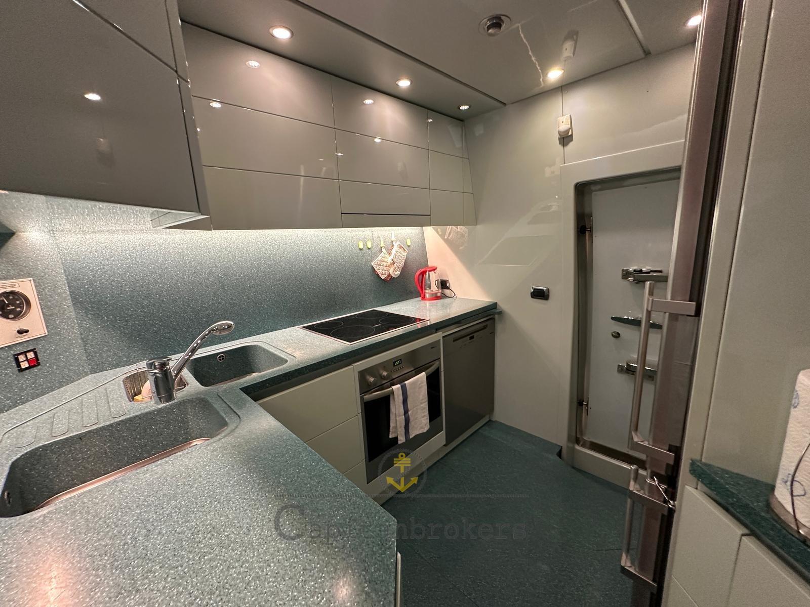 Mobilier intérieur en bois de cerisier laqué brillant en bon état général, Parquets avec moquette légère. Double salon avec canapés en cuir, 4 toilettes avec douche et bidet.