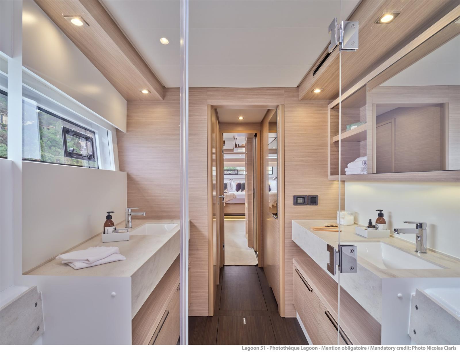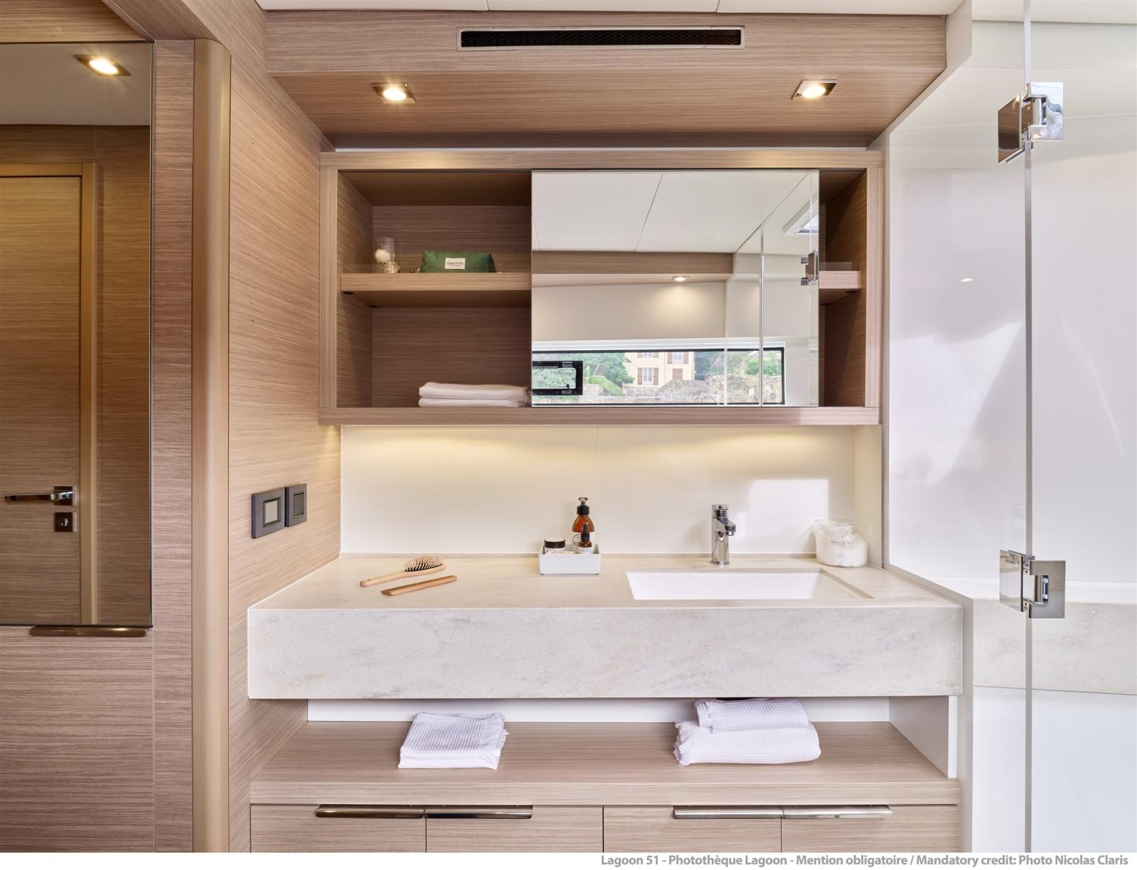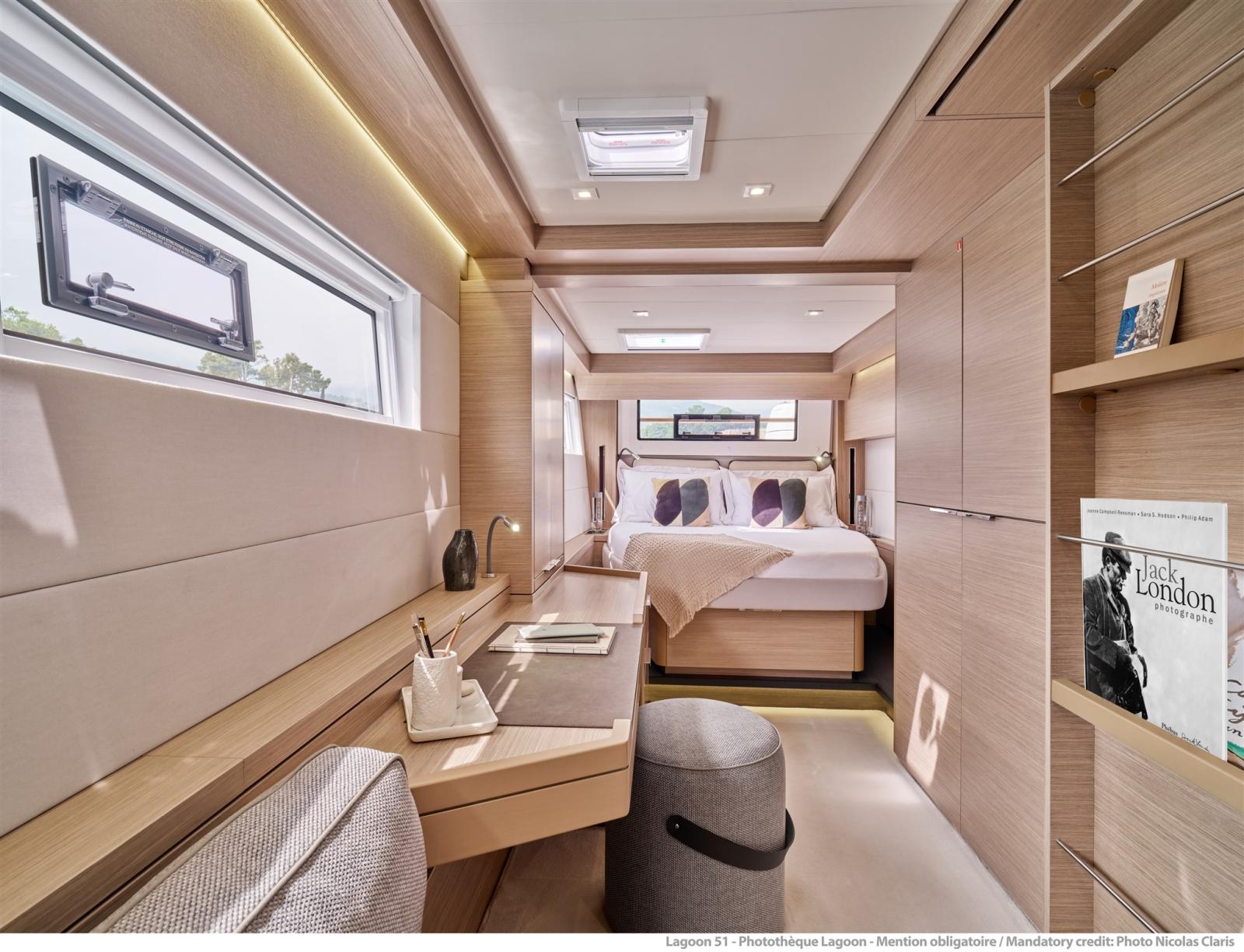 Entrez dans le spacieux salon et découvrez le concept d'espace innovant. Comme le mât est placé à l'extrémité avant du salon, il ne gêne pas la vue depuis le salon. Cet espace est inondé de lumière grâce aux fenêtres verticales à 360°. La nouvelle finition de bois "chêne sable Alpi" renforce cette sensation d'espace. Où que vous soyez, le volume de ce salon est impressionnant et permet une circulation aisée. En outre, il offre toutes les solutions pratiques que l'on peut attendre d'un Lagoon. La cabine du propriétaire bénéficie également de cette optimisation de l'aménagement et offre un grand dressing de série.