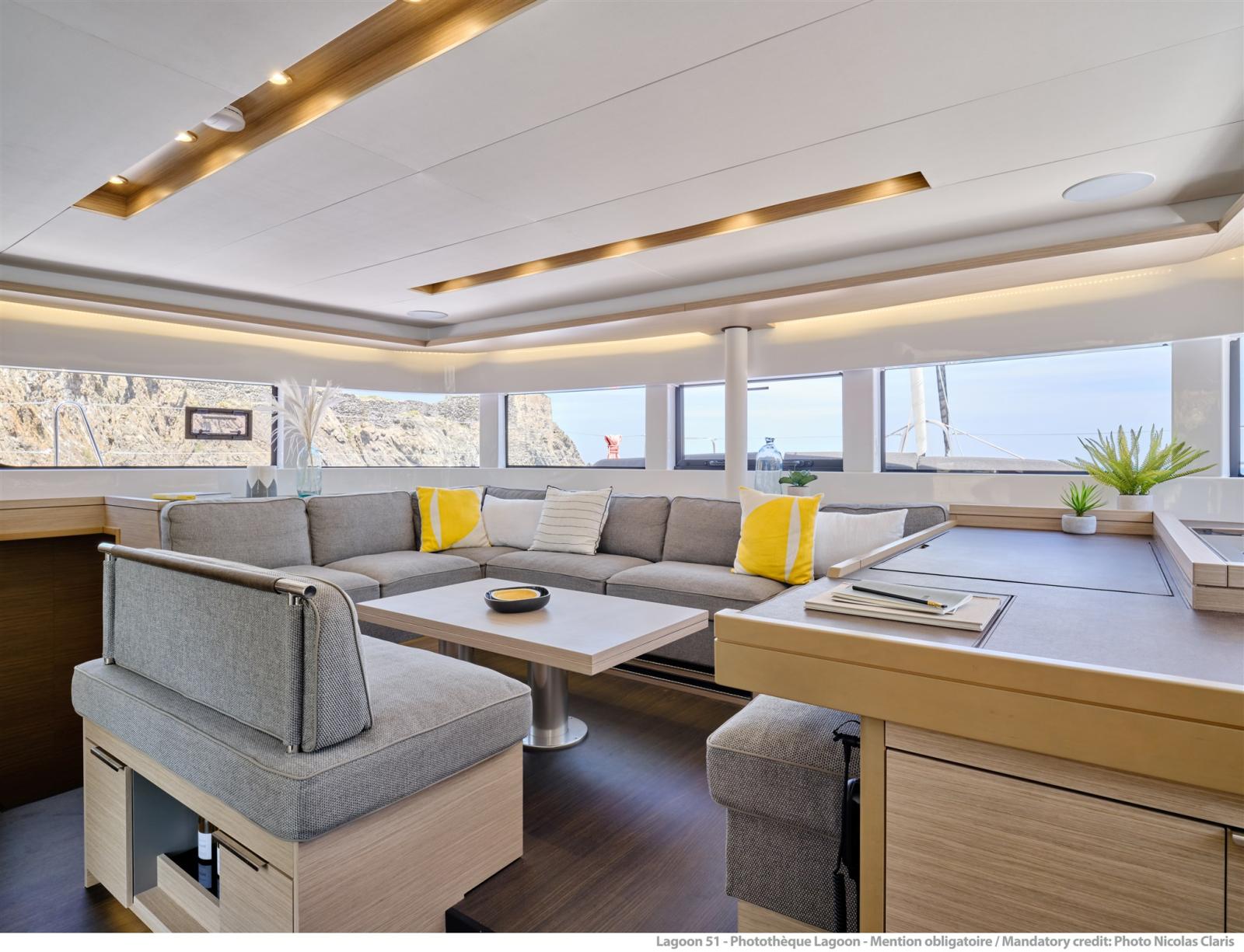 Cet endroit confortable est apprécié au mouillage mais aussi en navigation. Grâce à la pleine hauteur debout dans le fly bridge, il peut être utilisé en toute sécurité en cours de route. Les manœuvres sont à portée de main depuis le poste de pilotage, tandis que les invités peuvent se promener sans déranger le timonier. Le flybridge du Lagoon 51 est innovant par la modularité de ses espaces, son ergonomie intelligente et la convivialité de ce grand espace de vie.