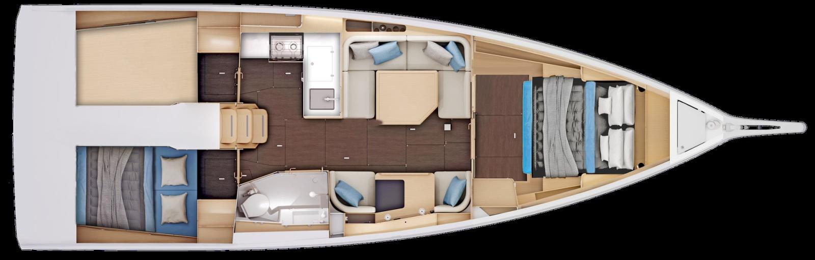 Notre modèle d’origine est une version à deux cabines, équipée d’une quille courte. Cela fait 1,60 mètre de profondeur. À l’intérieur, vous trouverez une seule chambre humide, de sorte que le lit à l’avant est placé directement dans la cabine. Le meublement de deux cabines crée un immense espace pour stocker tout le matériel de navigation.