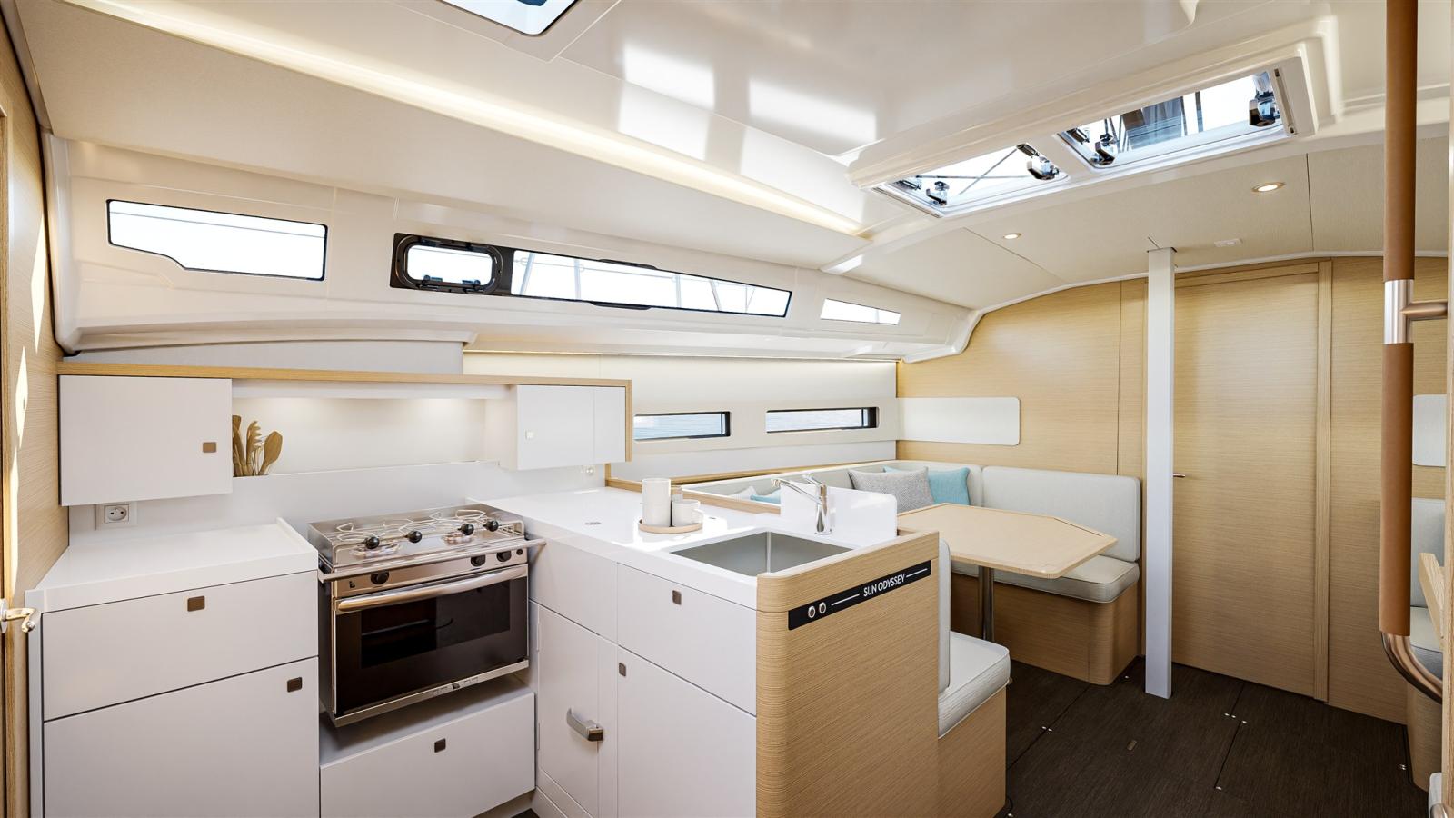 Son intérieur lumineux et accueillant est conçu pour une véritable expérience de navigation. Une cuisine en forme de L, un salon accueillant, un rangement élégant et des espaces de vie soigneusement conçus créent un environnement naturel et authentique pour profiter de chaque instant en mer.