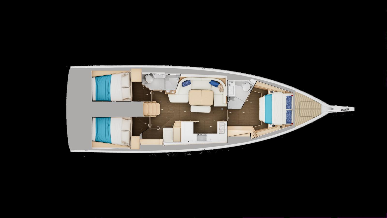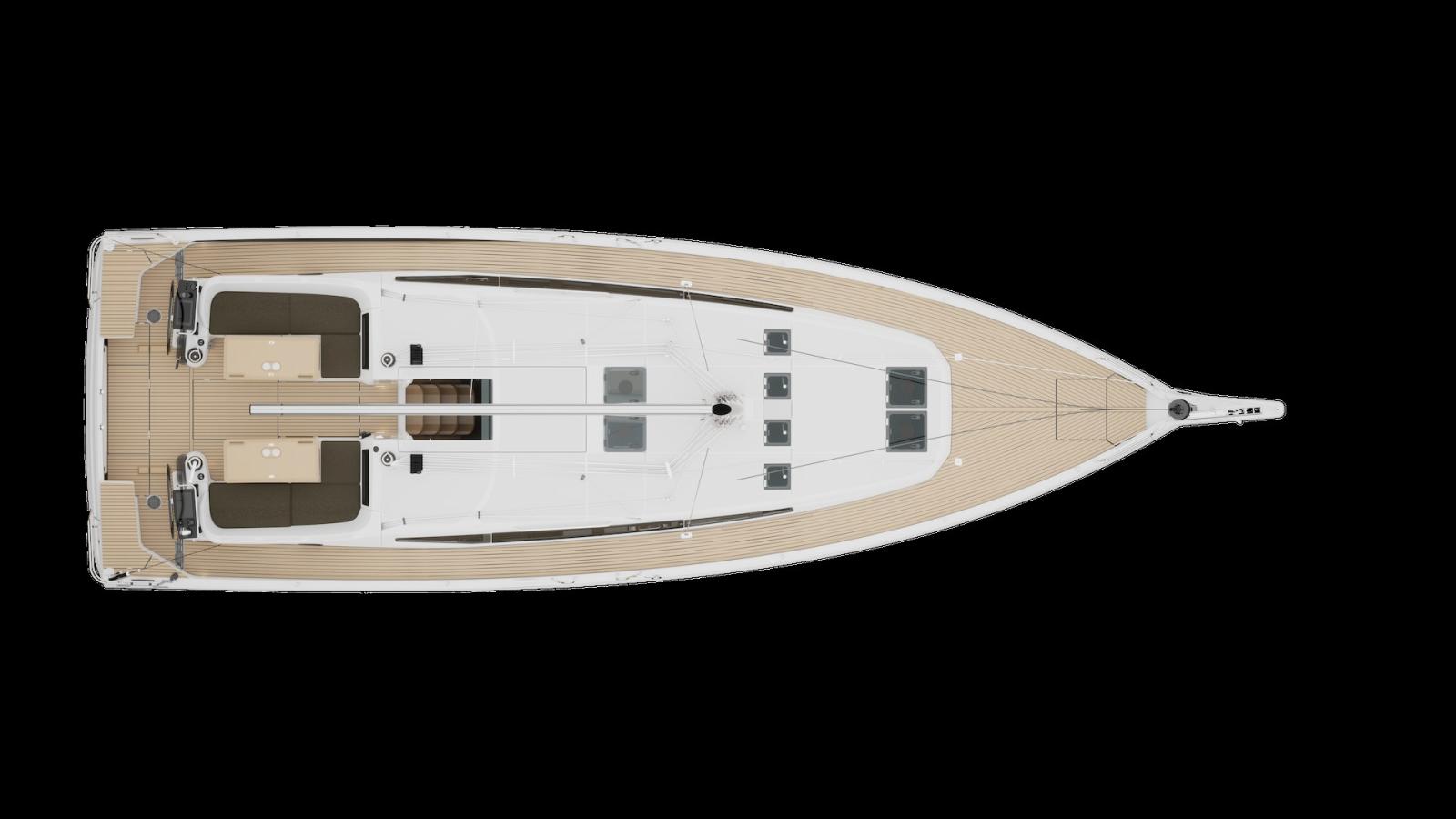Ancre (Anchering package), Eau sous pression, Batteries (AGM of Lithium), Câble d’alimentation à quai, Filière, Douche de cockpit (Warm en koud), Propulseur d'étrave (Retractable), Fixation de l’ancre (Lijn en ketting), Moniteur de batterie, Plateforme arrière (Optioneel), Pont en teck (Optioneeel in Irioco hout), Prise de quai, Gréement monotoron, Echelle de coupée (Uniek doorlopend gangboord), table de cockpit, Table pliante de salon (Hout of kunstof), Filières avec sortie latèrale (Optioneel), Winch électrique (Optioneel), Windex.