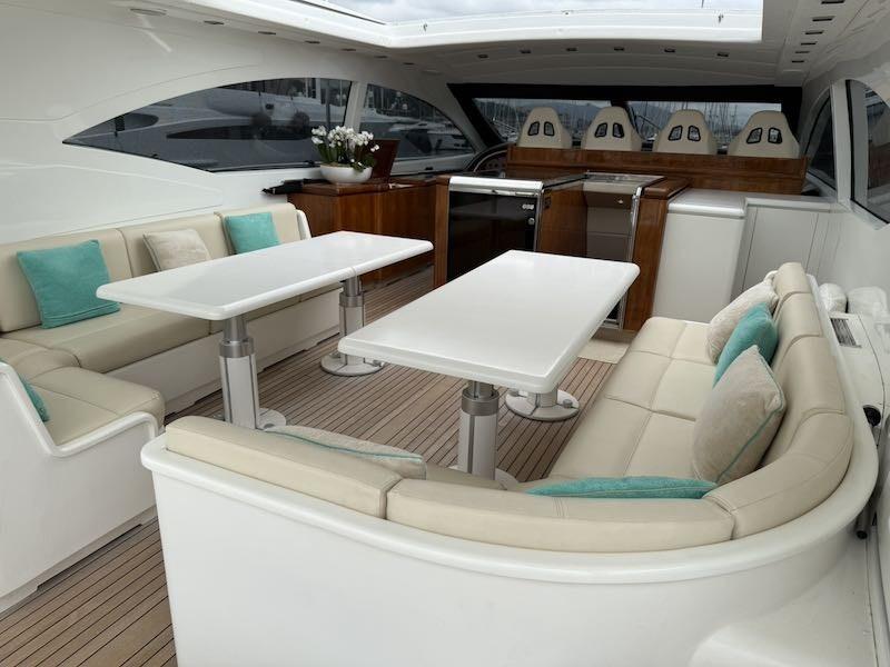 La plateforme arrière mène au grand cockpit extérieur caractérisé par un pont solaire central confortable. En direction de la proue, la salle à manger composée de 2 canapés en forme de L assis de chaque côté et protégés par un hardtop. Vers la proue, du côté tribord, se trouve la station de pilotage avec des sièges pour 4 personnes, pilote et passagers, compris.