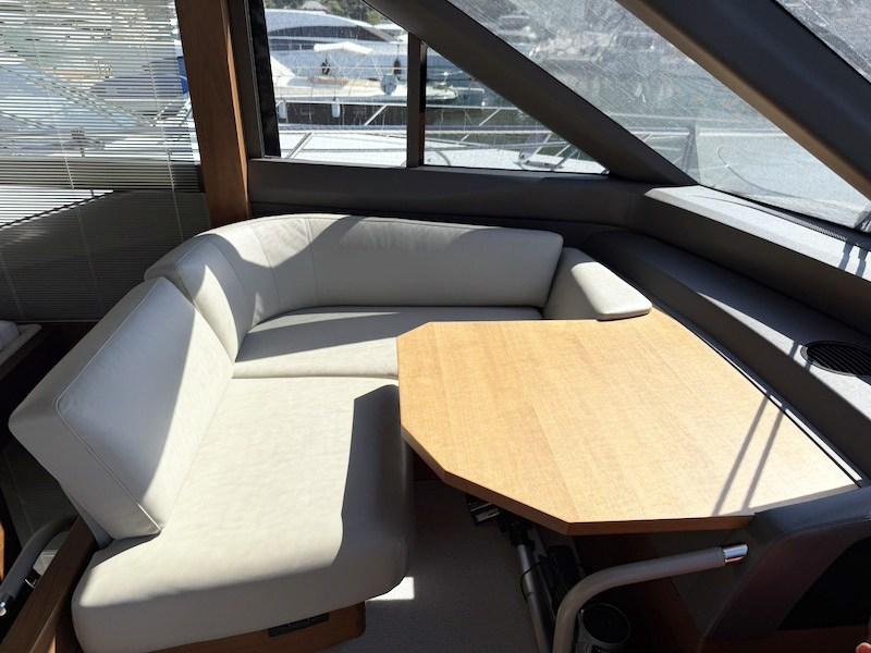 Par la grande plateforme arrière, il est possible d’accéder au cockpit protégé par la braguette et caractérisé par un grand canapé en forme de U avec une table pour les déjeuners en extérieur.