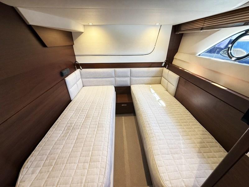 En descendant sous le pont, par l’accès latéral à la timonerie, on trouve les cabines doubles avec lits plats desservies par une salle de bain commune, tandis qu’à l’avant, la cabine VIP avec salle de bain attenante.