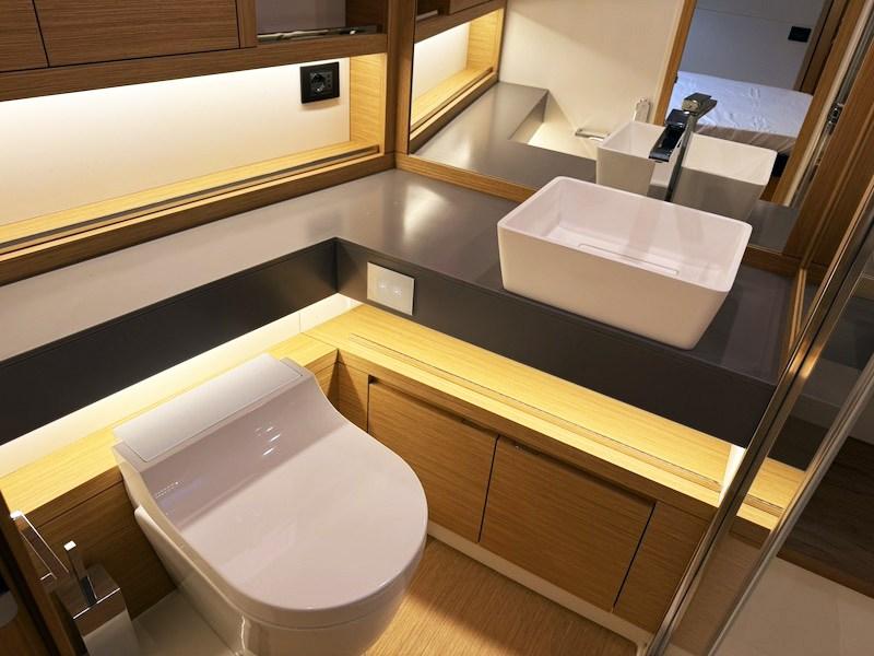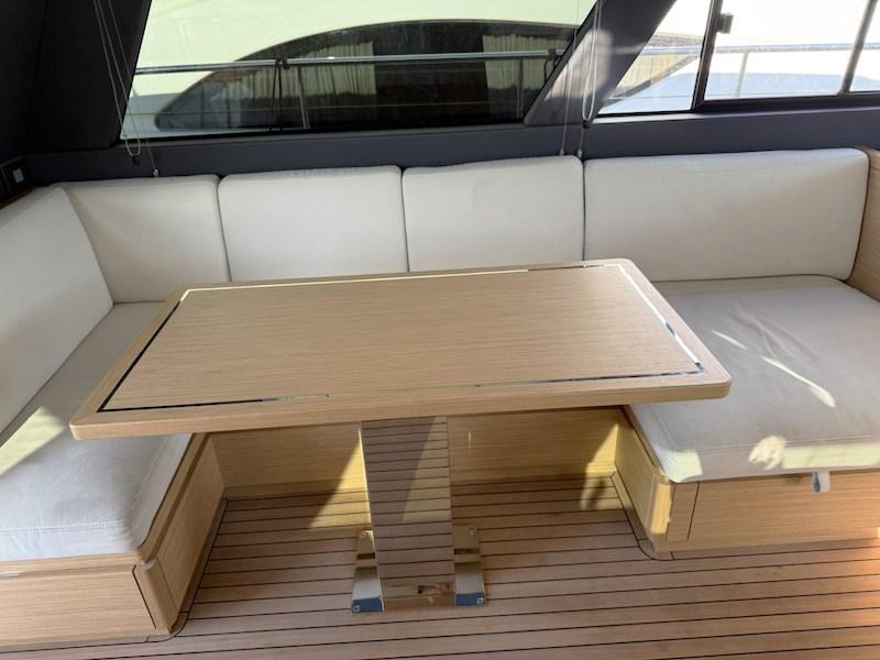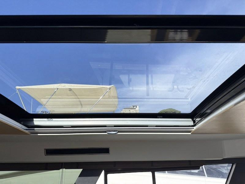 La plateforme arrière mène au cockpit, caractérisé par un canapé en forme de U confortable qui se transforme en pont d’exposition. La grande fenêtre sépare l’espace extérieur convivial de la salle à manger intérieure. Il s’agit d’un canapé en forme de C à gauche tandis que de l’autre côté se trouve la cuisine. En direction de la proue, se trouve la timonerie avec des sièges pour le pilote et le copilote sur tribord, l’accès à la cabine de l’équipage sur la gauche.