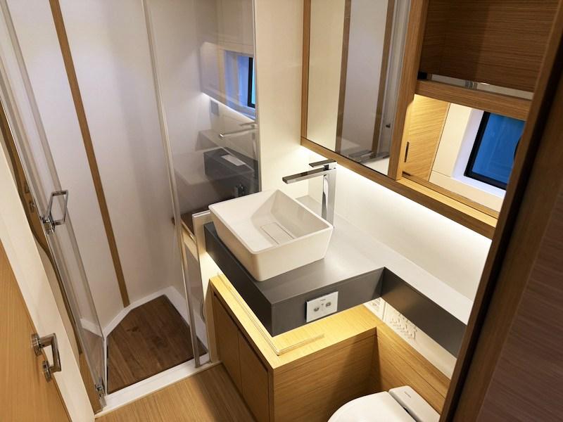 En descendant sous le pont, la zone de couchage se caractérise par 3 cabines : 1 cabine principale avec salle de bain attenante à l’extrême proue, 1 cabine d’amis avec lits plats et 1 cabine d’amis avec lits superposés, desservie par une salle de bain.