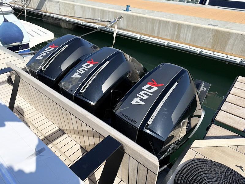 Le Wallytender X est la version hors-bord et le X signifie « euphorie », générée par les très hautes performances garanties par les 3 moteurs hors-bord qui poussent la coque à plus de 50 nœuds de vitesse maximale.