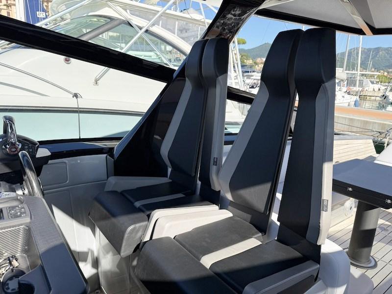 Plus loin sur tribord, protégé par l’auvent rigide, la timonerie avec les 2 sièges pour le pilote et le copilote a été installée.
