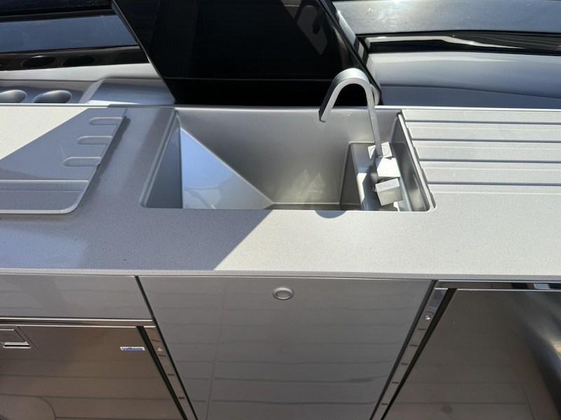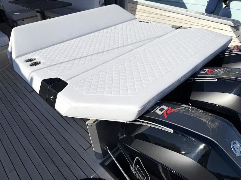 Grâce à la petite mais fonctionnelle plateforme arrière, équipée d’une passerelle hydraulique, vous pouvez accéder au grand et pratique cockpit de contournement de la voiture. Dans la zone arrière, devant les moteurs hors-bord, le confortable pont solaire a été placé en position centrale. Caractéristiques de cette zone sont les remparts repliables qui permettent un contact direct avec la mer.