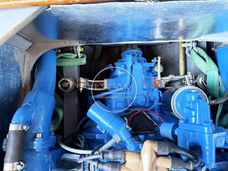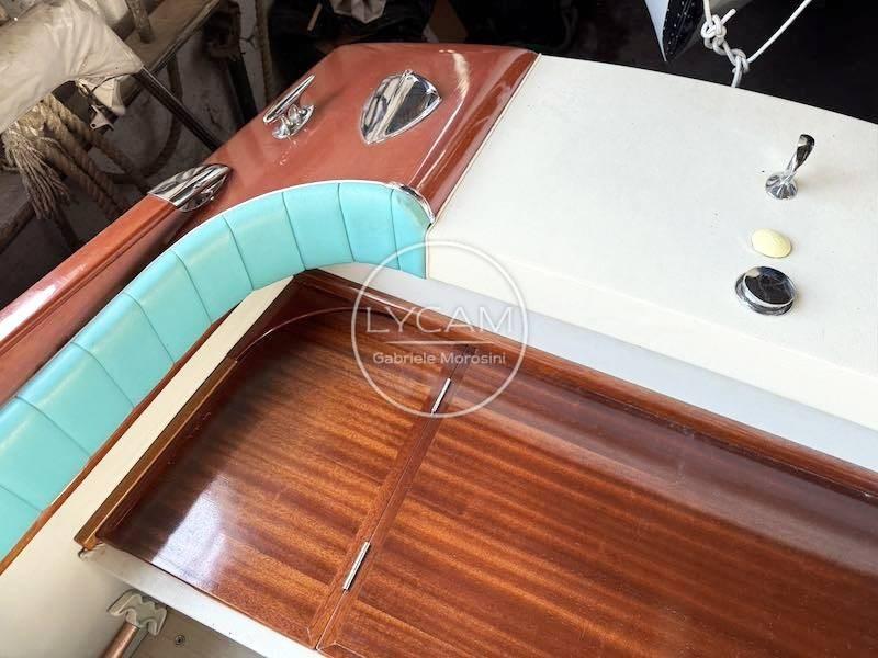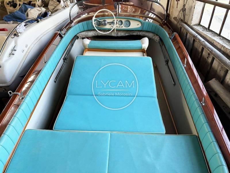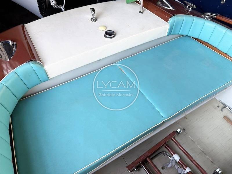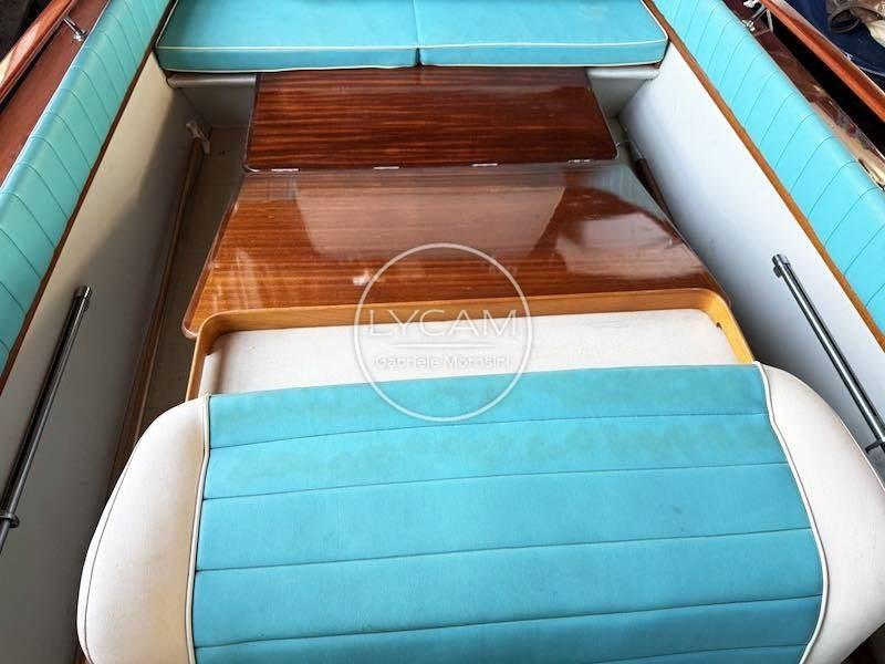 La disposition du pont comprend un grand cockpit unique sur lequel on peut facilement marcher debout, protégé par les remparts et des rampes en acajou raffinées fixées sur des supports et extrémités en bronze chromé. Le capot moteur se trouve au centre du cockpit et sert de base pour accueillir un matelas relié aux sièges arrière, devenant ainsi une grande zone de bronzage unique. Devant le compartiment moteur, en plus d’une étagère en bois pratique, se trouvent les sièges pilote et copilote qui servent la timonerie caractéristique d’inspiration automobile, protégée par un pare-brise enveloppant sur profil chromé. Élégantes et distinctives du chantier naval, les combinaisons de couleurs du rembourrage vipla se concentrent sur les teintes crème du tableau de bord et les teintes turquoise des sièges, des dossiers, du joker et du matelas de bain de soleil