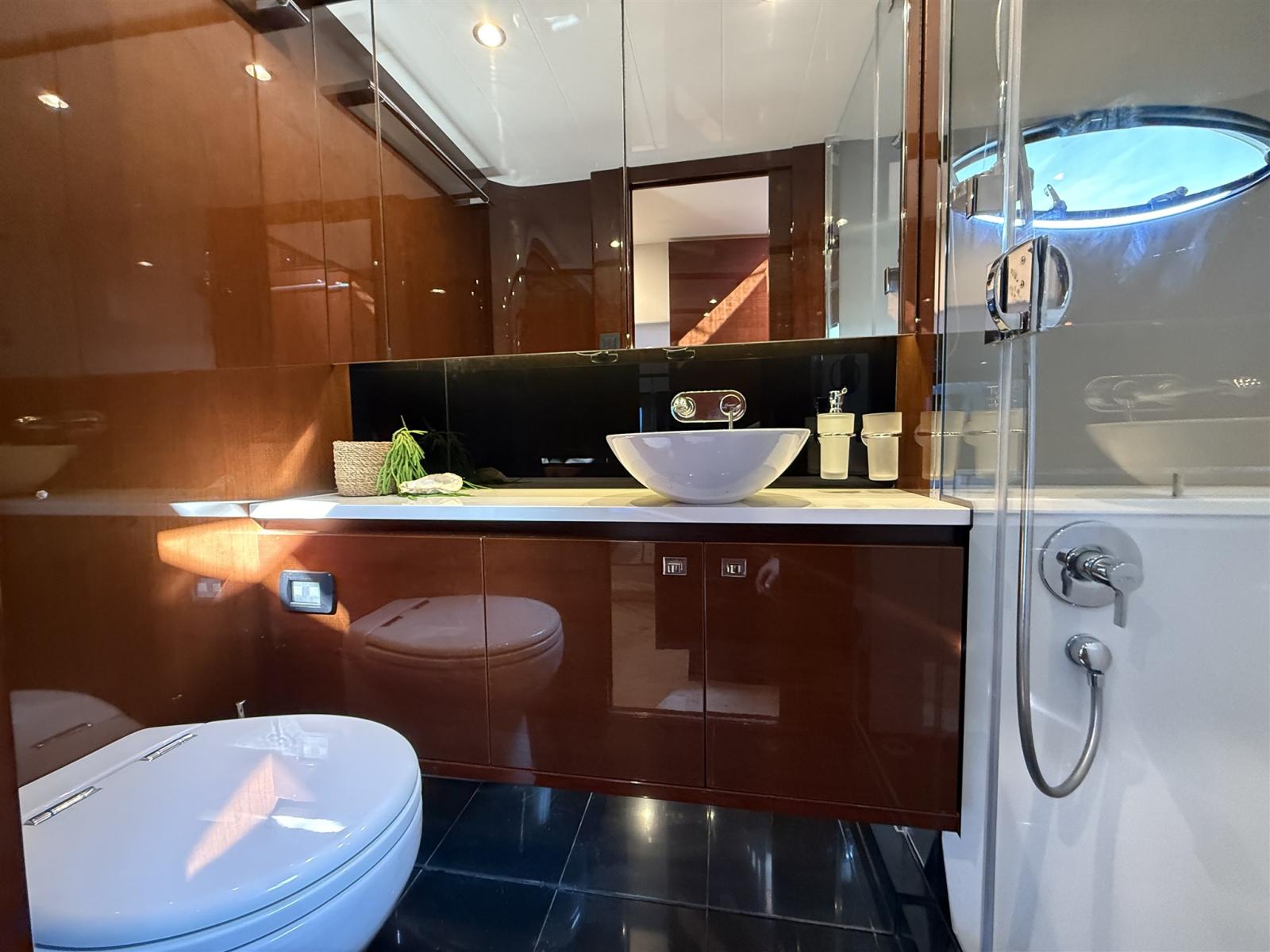 Toilette qui se décharge dans le réservoir de rétention mais a également la possibilité de se décharger directement par-dessus bord via une vanne en Y montée dans les tuyaux de refoulement. Le réservoir de rétention est doté d’une décharge électrique par-dessus bord ainsi que d’une pompe manuelle de rechange et de commandes d’amarrage.