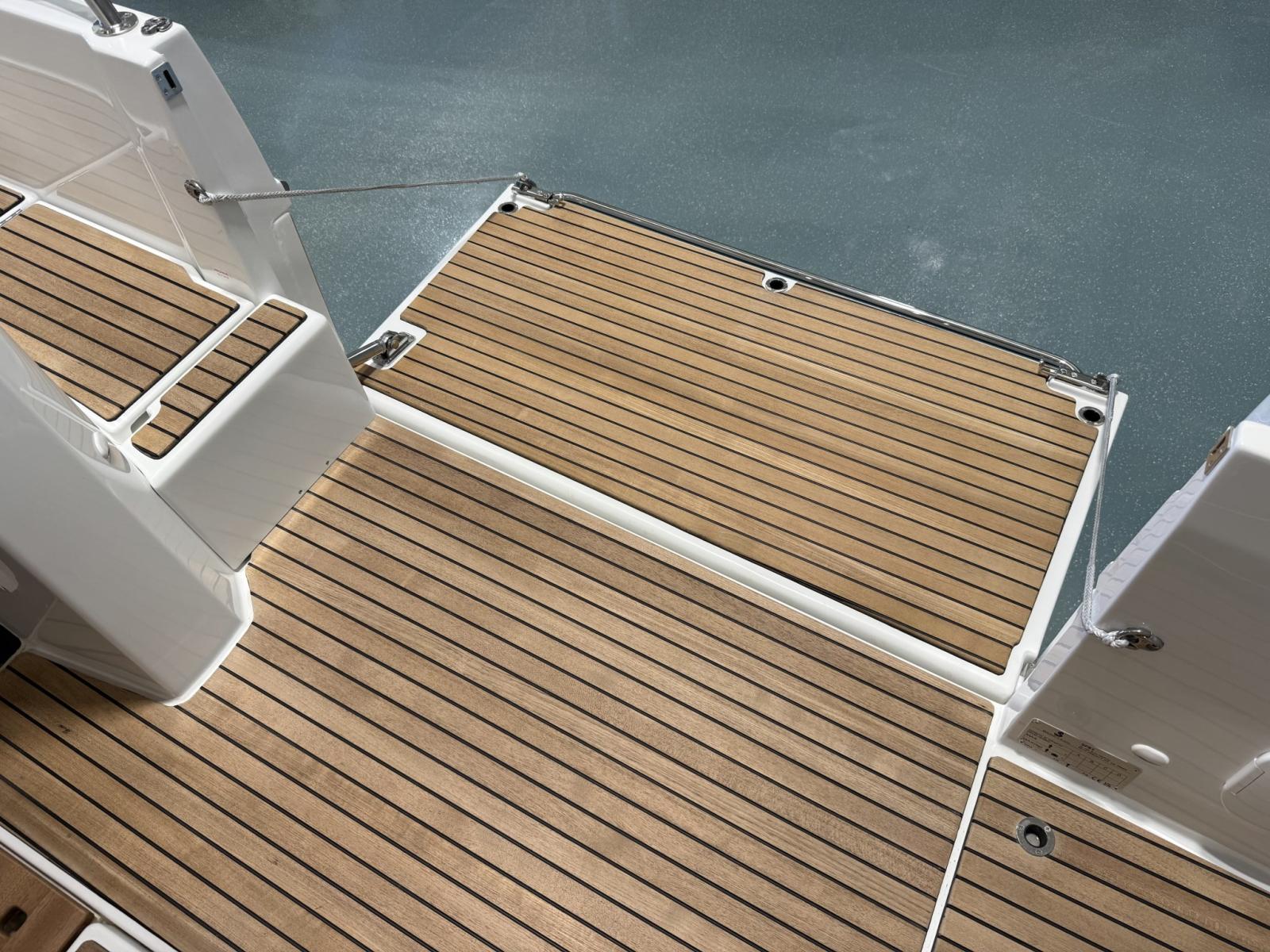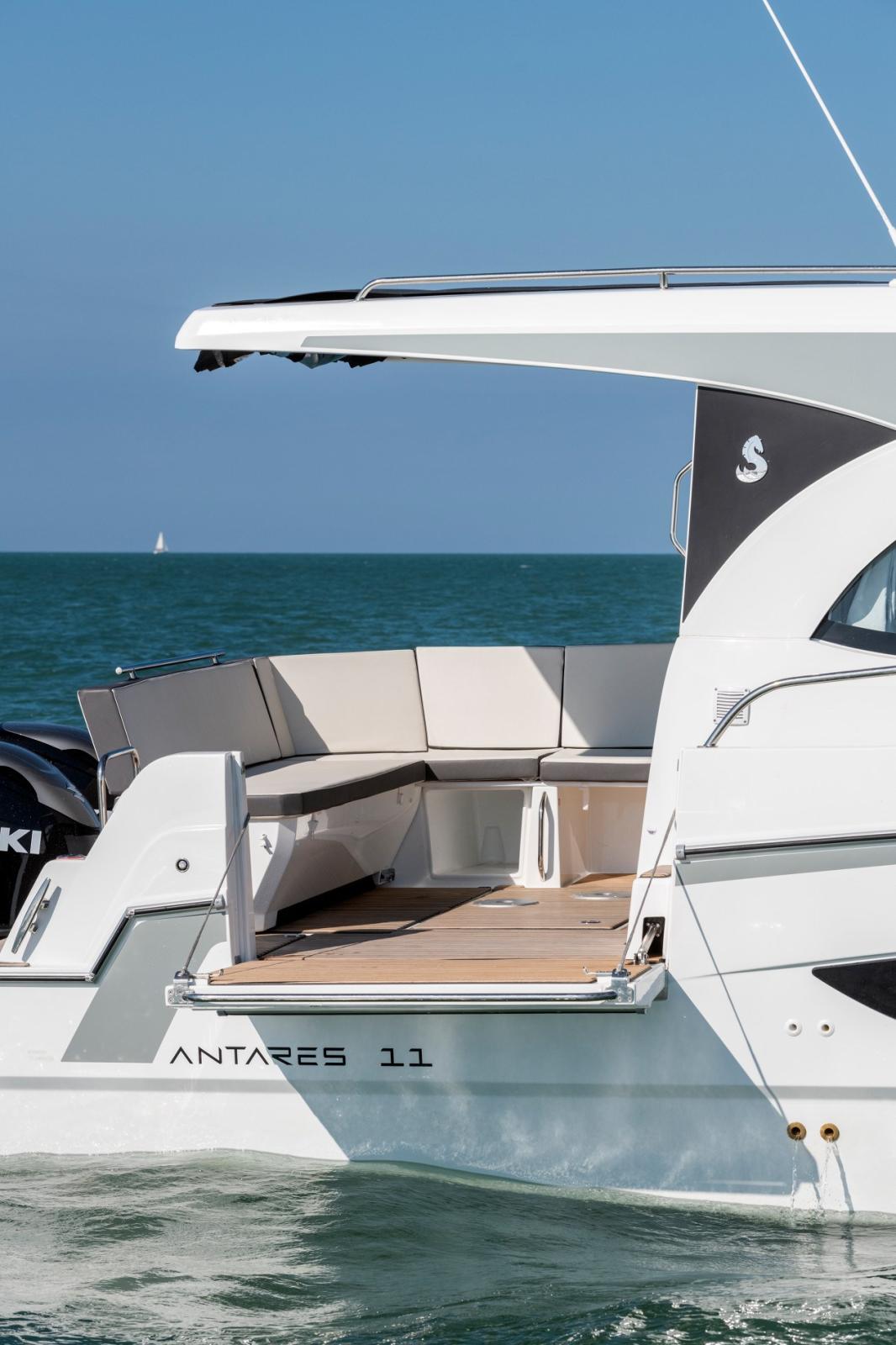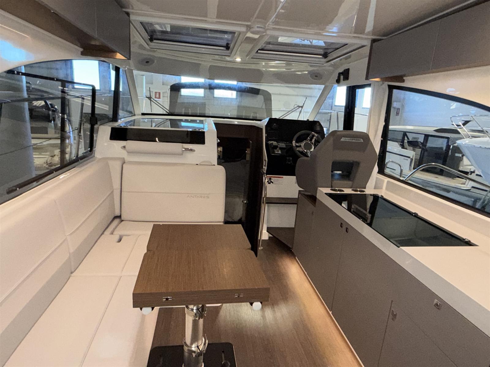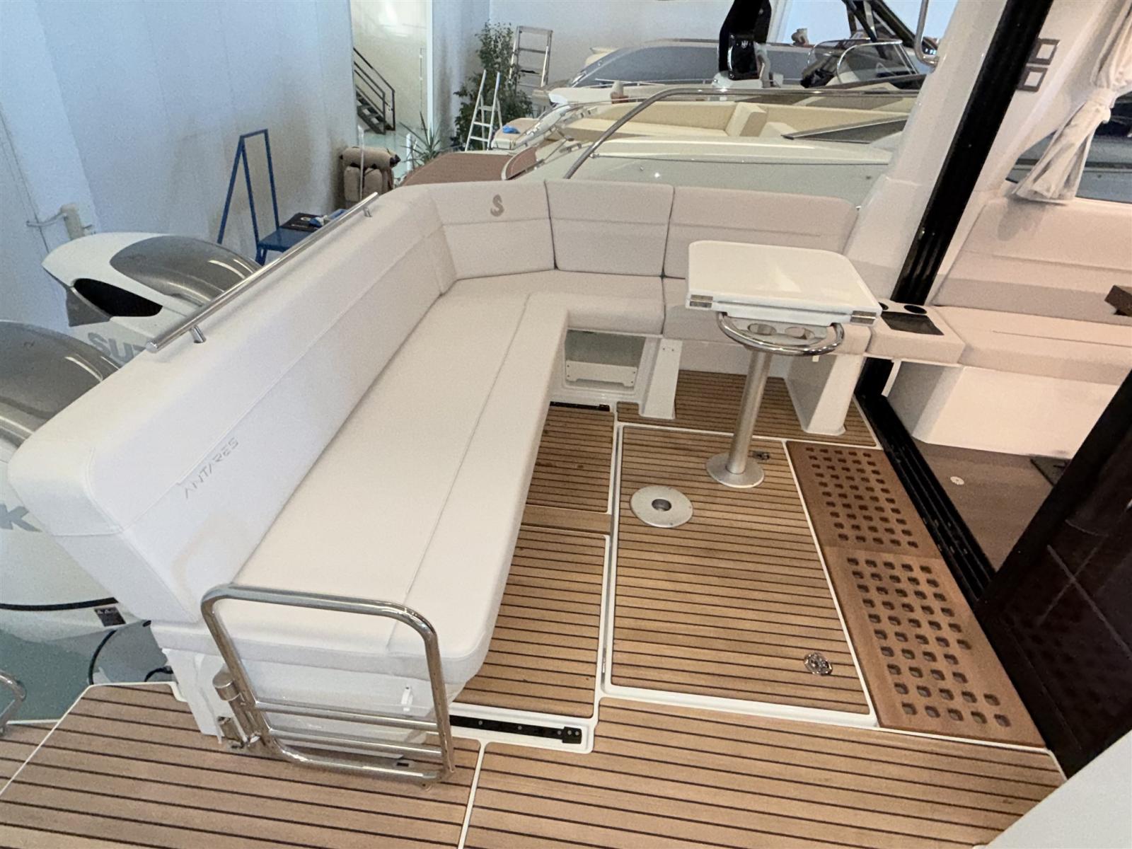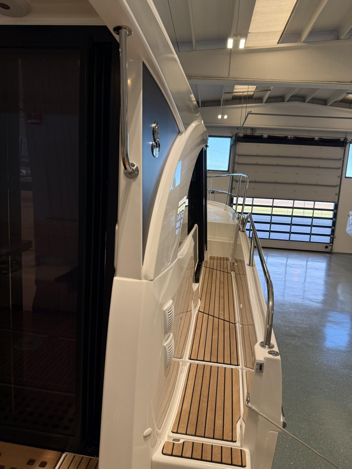 Alarme gaz, Alarme moteur, Eau sous pression, Douche de cockpit, Flaps électriques, Hard top, Indicateurs de flaps, Éclairage de courtoisie, Défenses, Plateforme arrière, Pompe de cale automatique, Pompe de cale manuelle, Porte latérale, Cockpit en teck, Prise de quai, Guindeau électrique, Echelle de bain, table de cockpit, Corne.