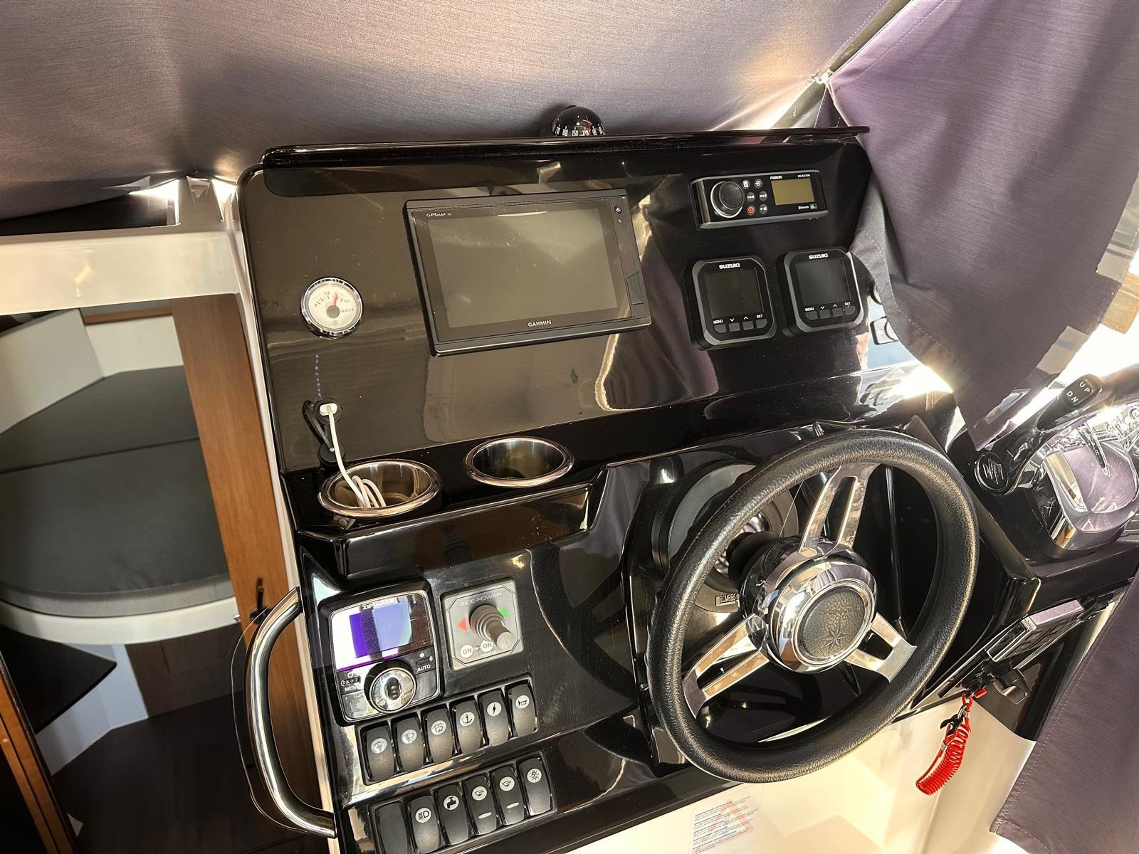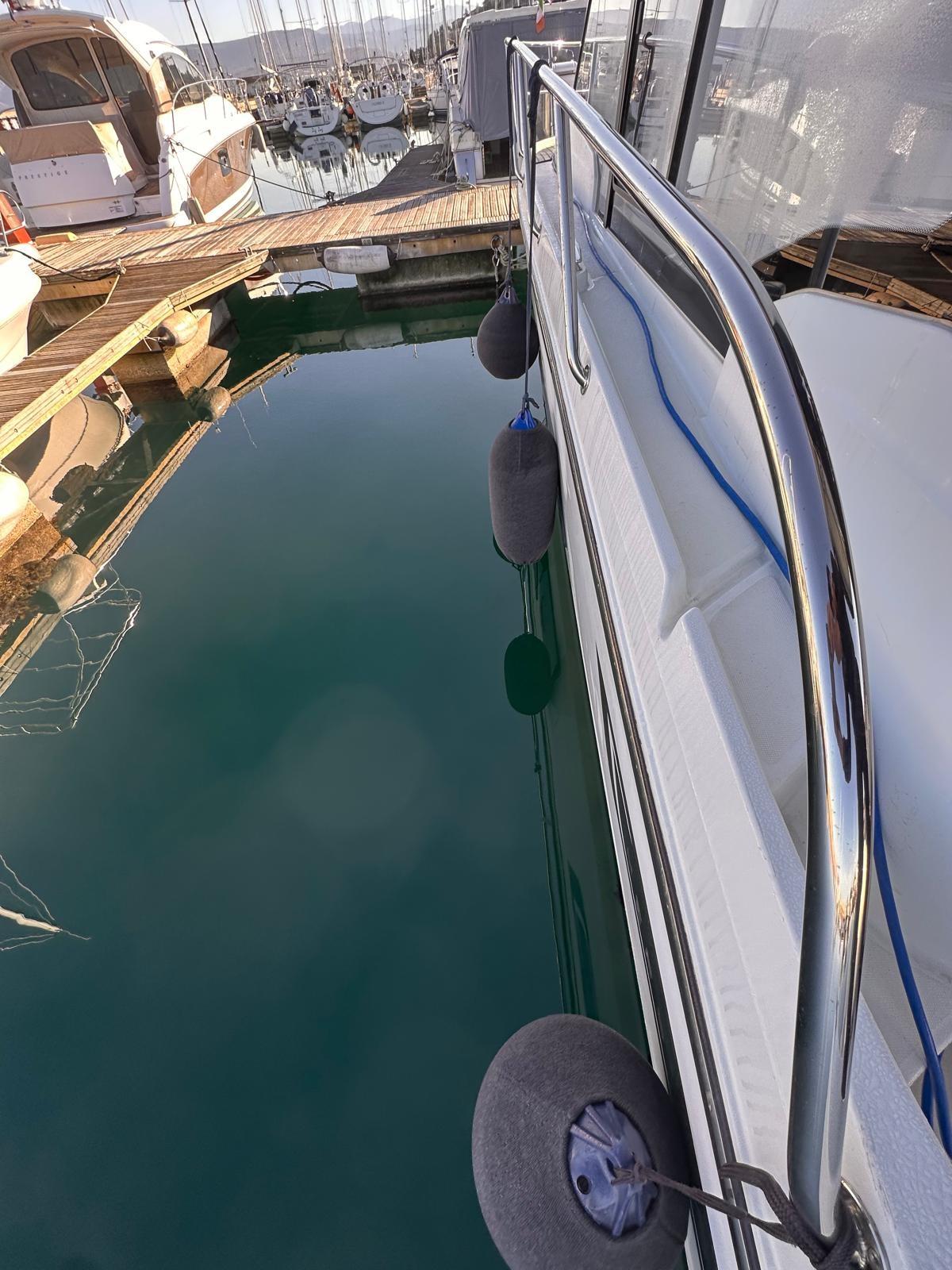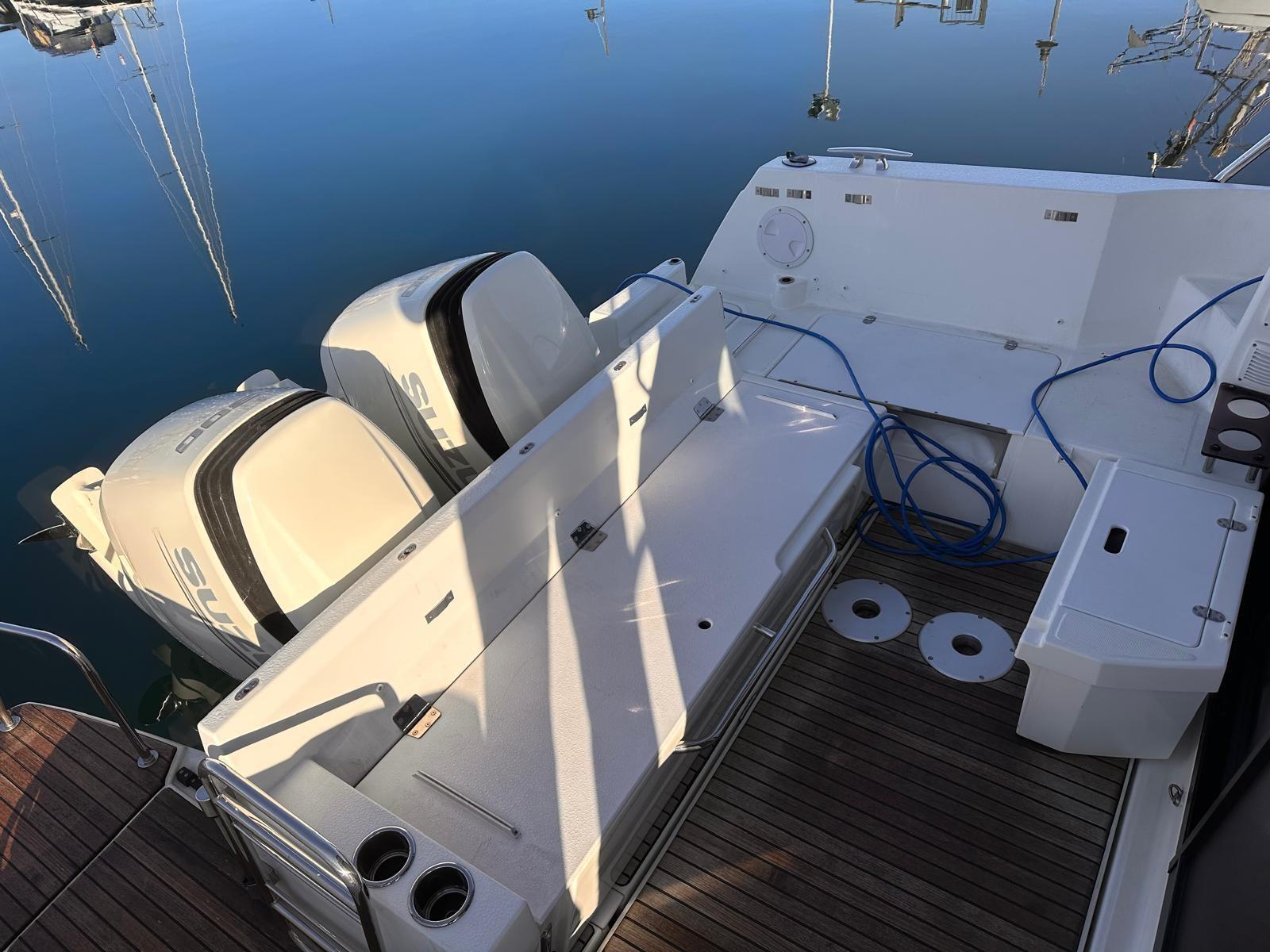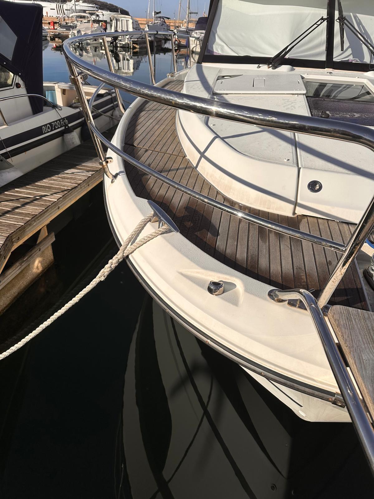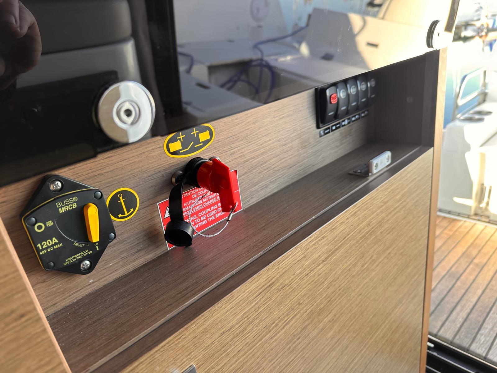 Alarme moteur, Alarme de pompe de cale, Eau sous pression, Passavant en teck, Douche de cockpit, Phare de poursuite, Flaps électriques, Indicateurs de flaps, Éclairage de courtoisie, Panneau solaire, Pompe de cale automatique, Porte latérale, Cockpit en teck, Prise de quai, Guindeau électrique, Echelle de bain, Corne.