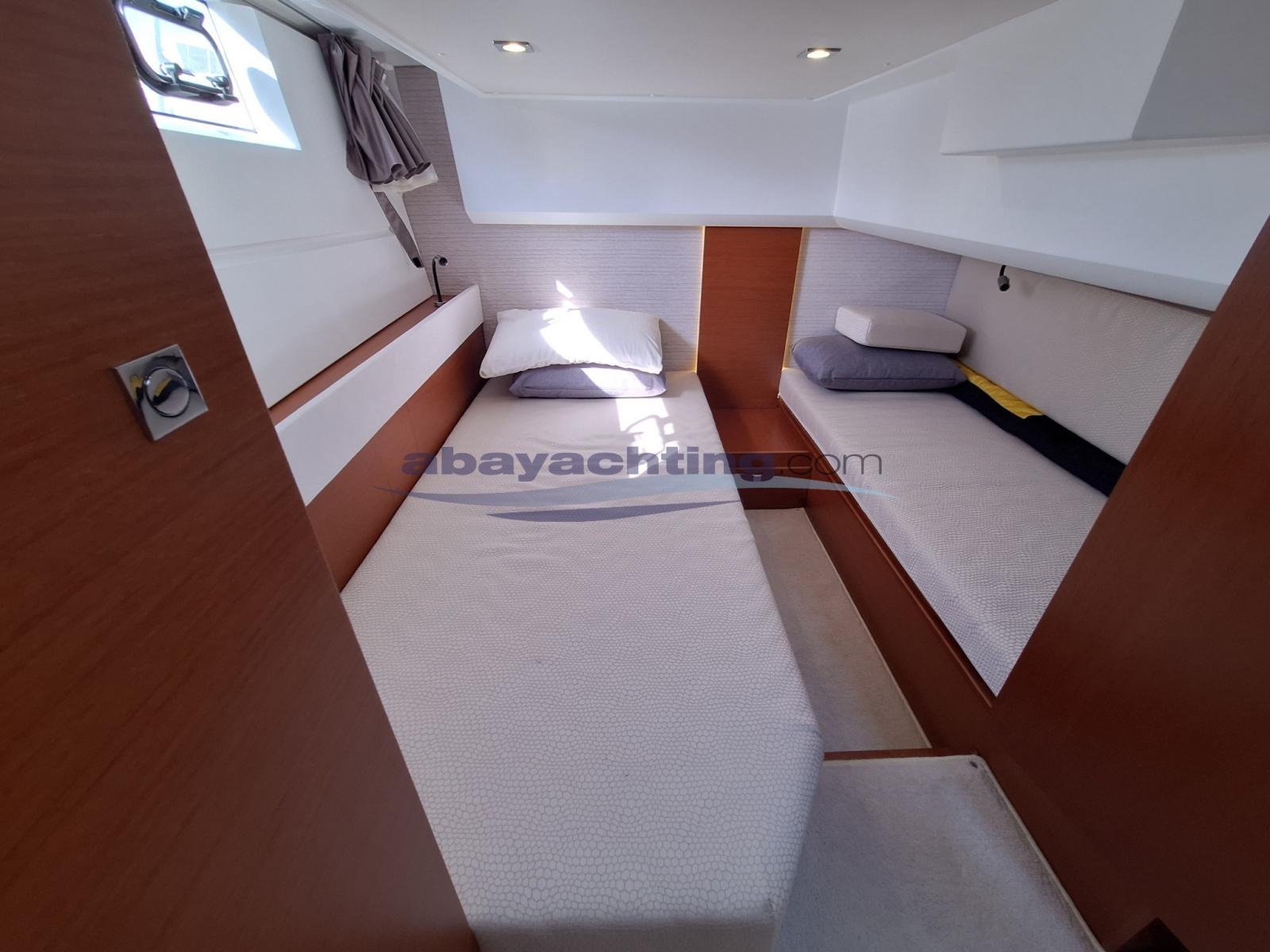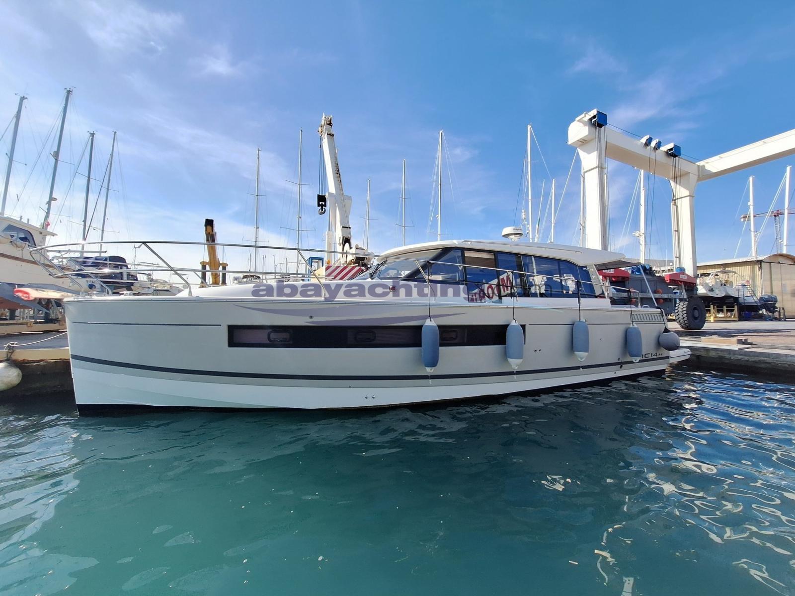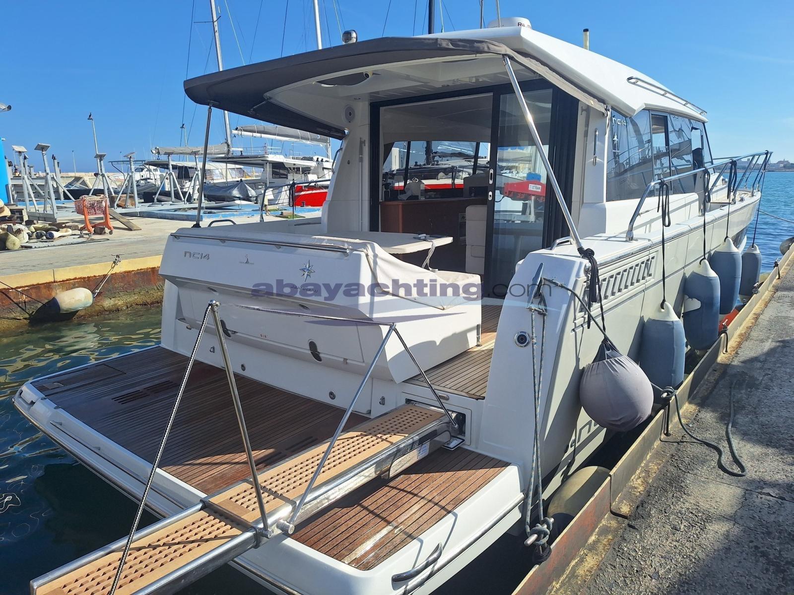 Jeanneau NC14 d'occasion. Aménagement 2 cabines, 2 salles de bain et dînette convertible.