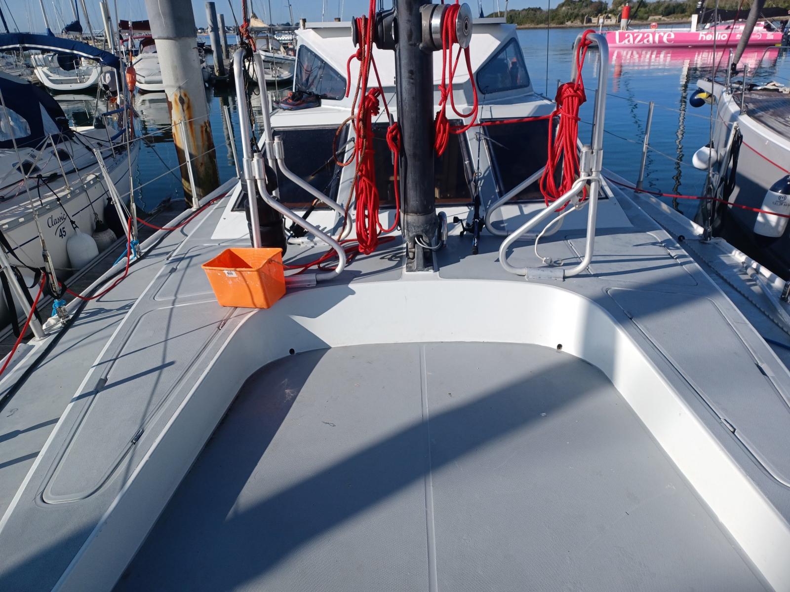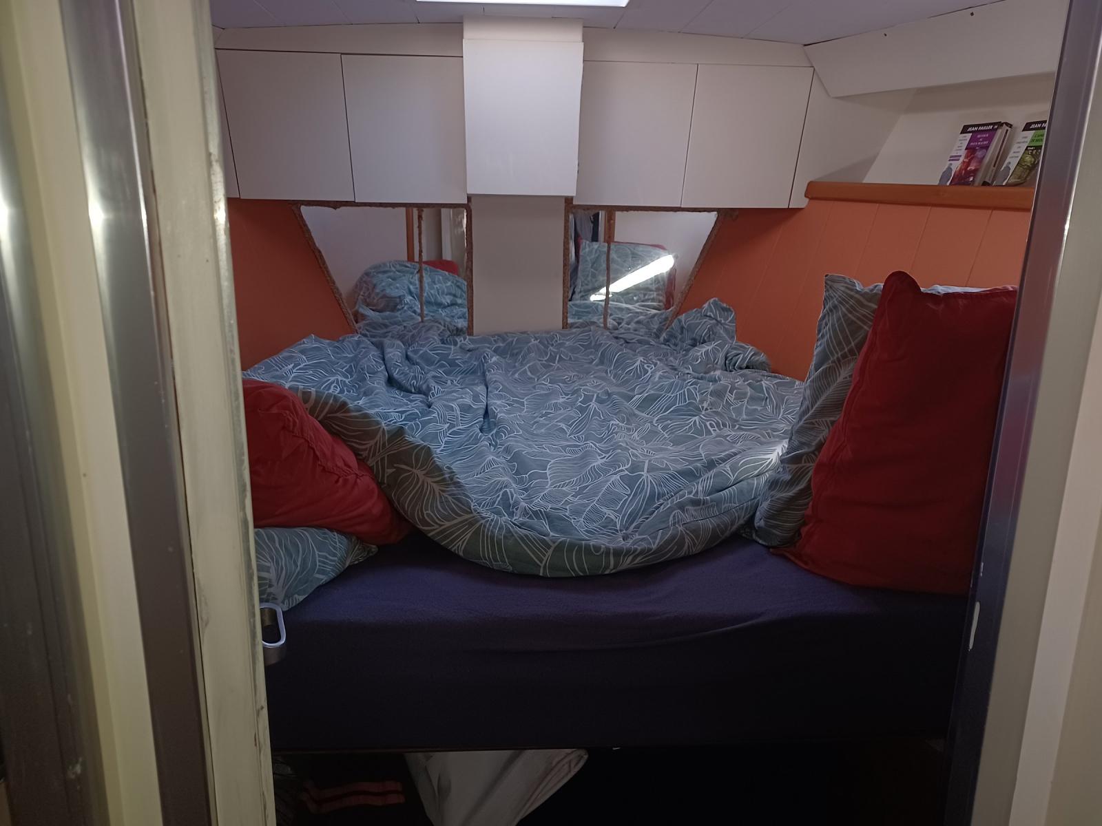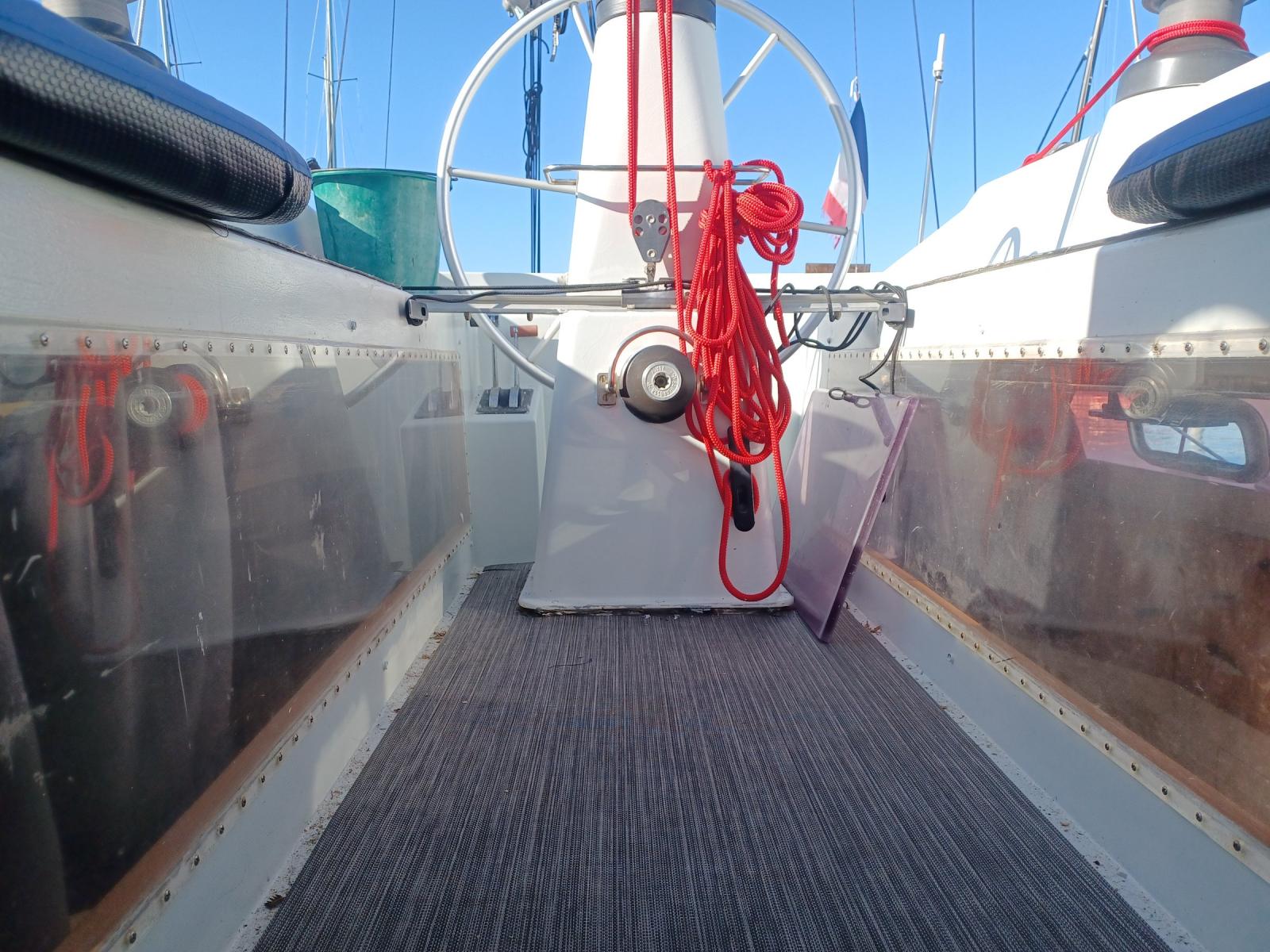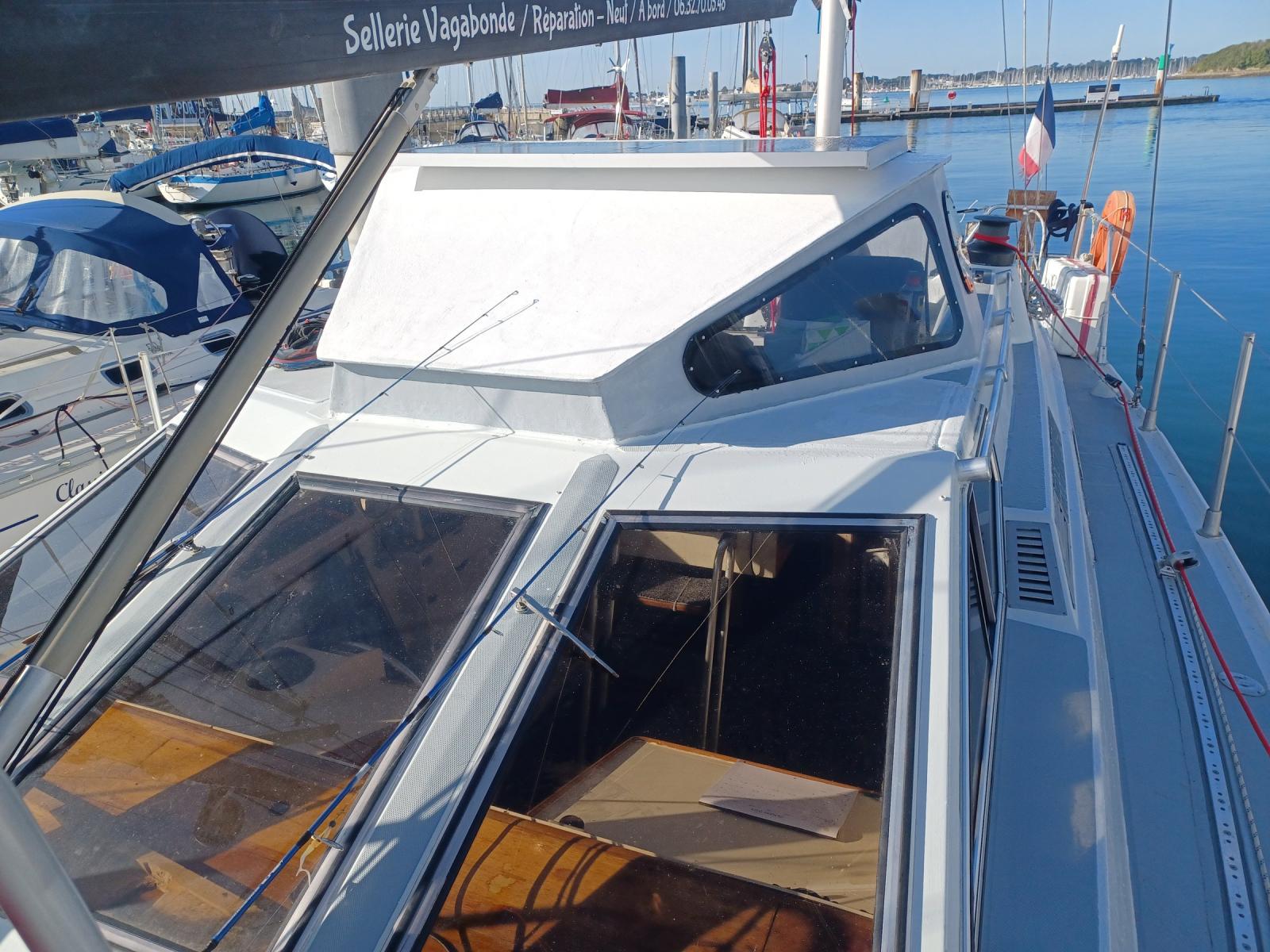 AMENAGEMENT : grand carré sous le cockpit avec cuisine en coursive, timonerie intérieure, une cabine double, une seconde possible (actuellement en atelier), une cabine team, nombreux rangements.