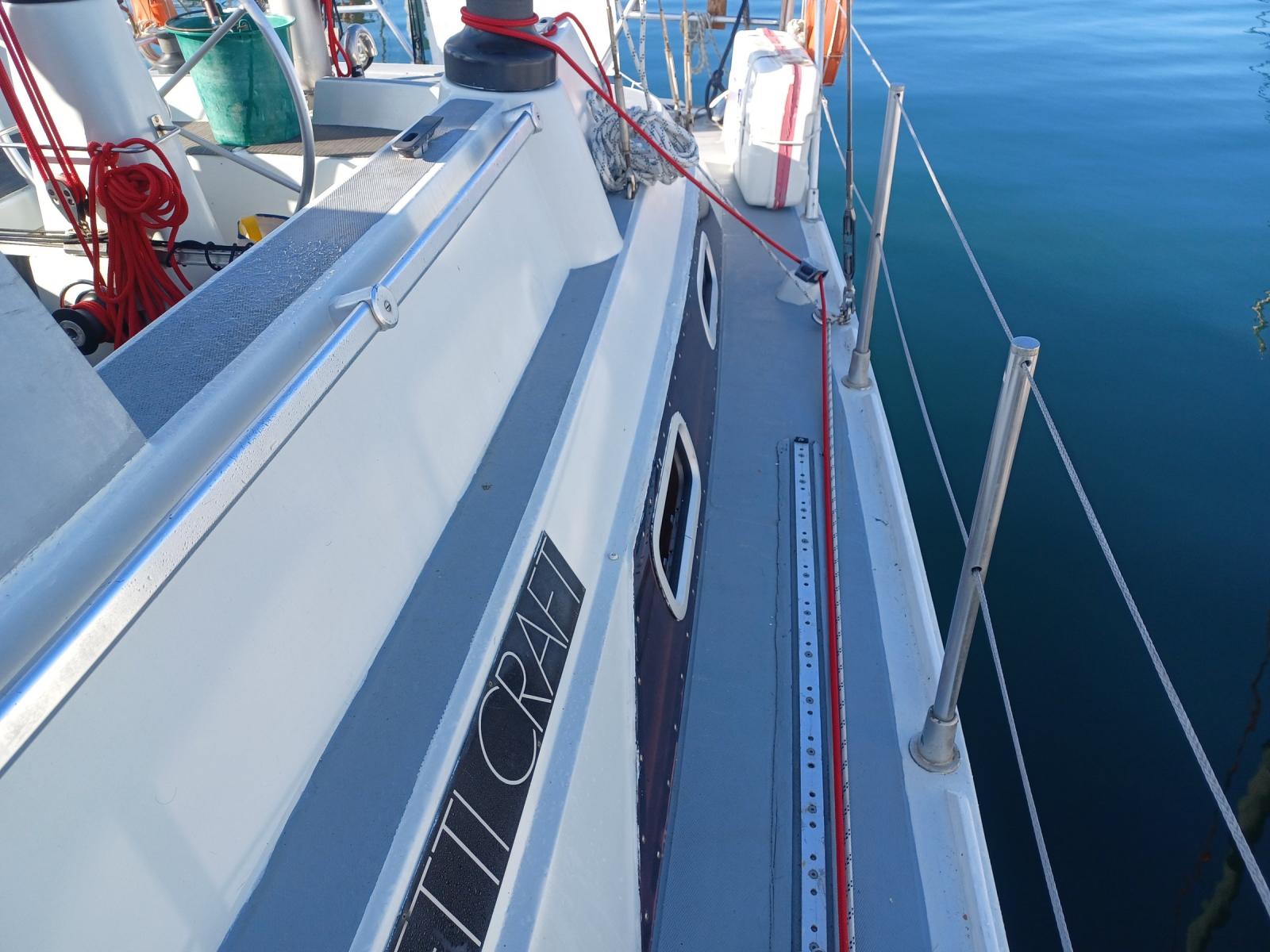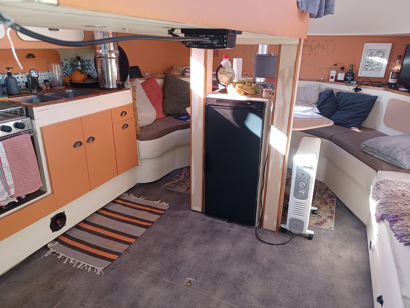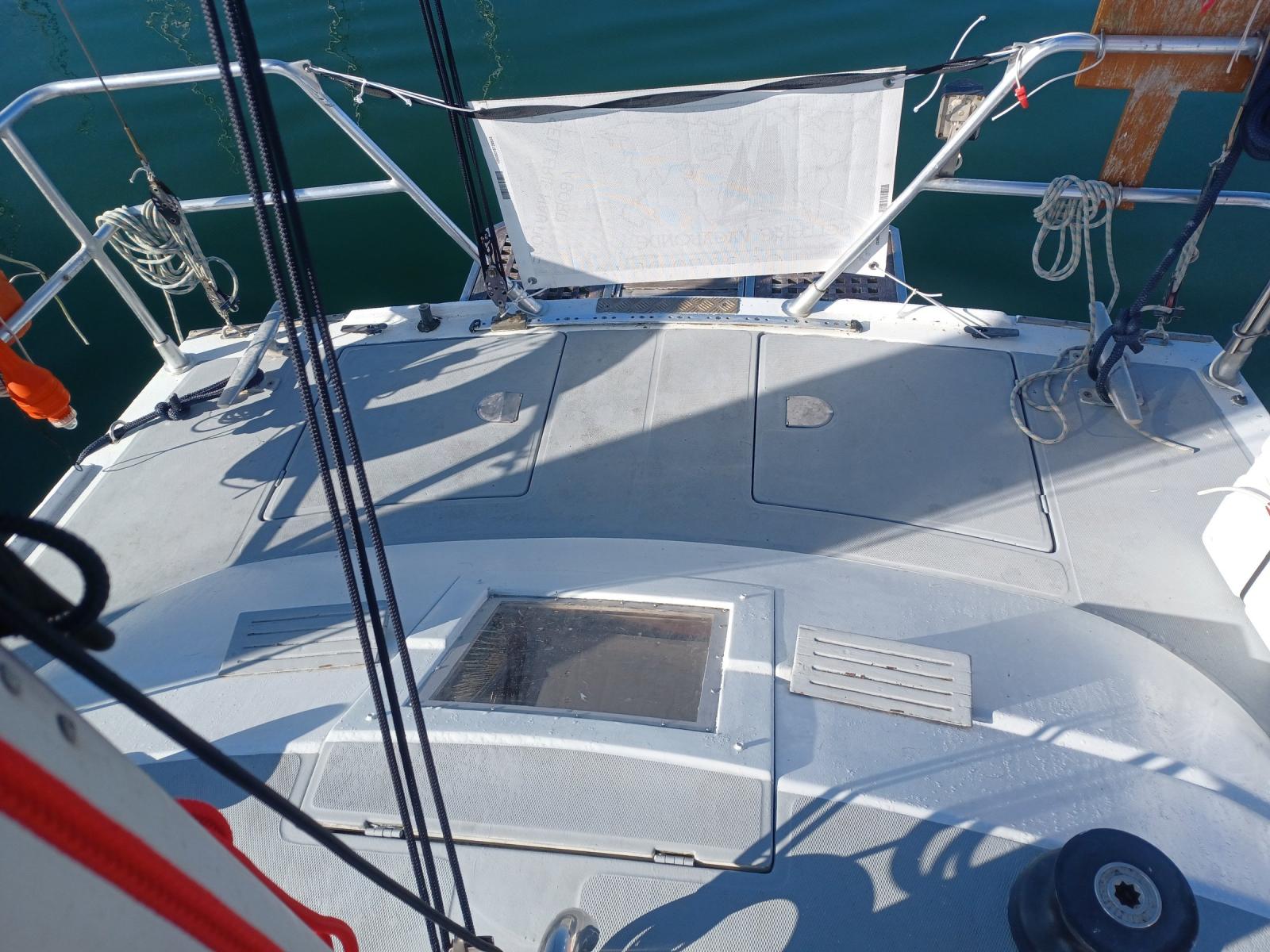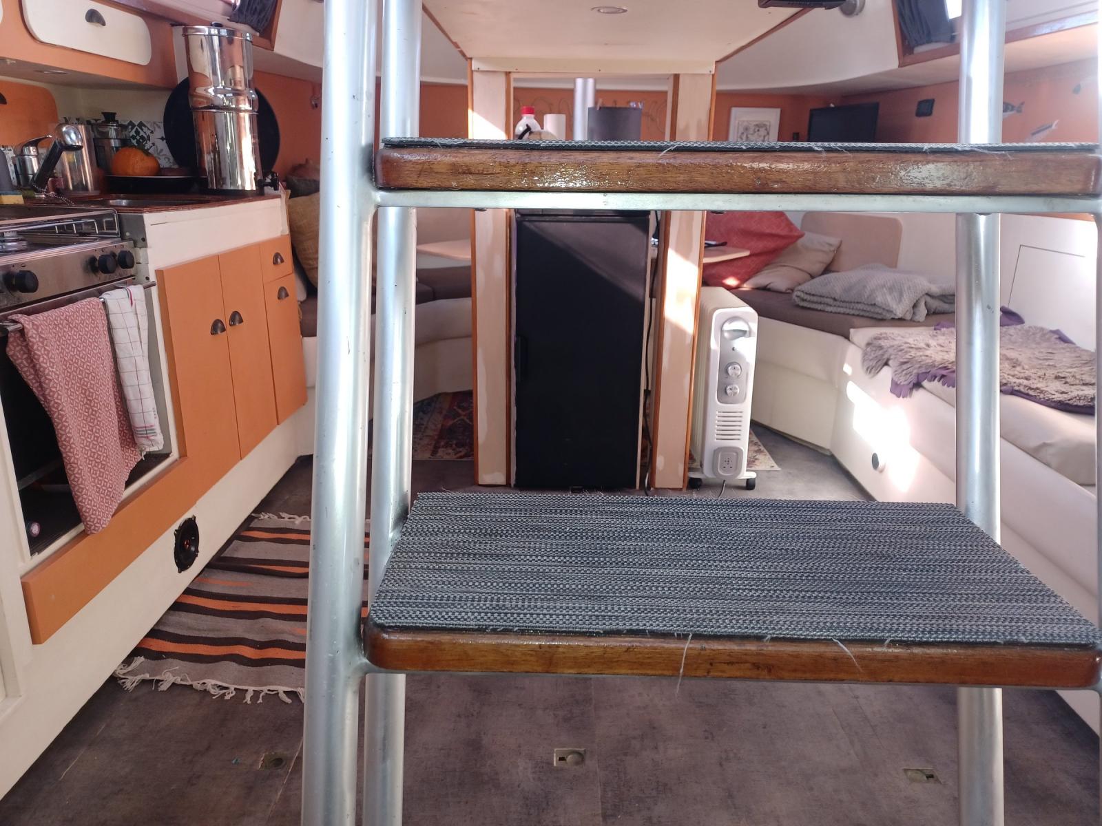AMENAGEMENT : grand carré sous le cockpit avec cuisine en coursive, timonerie intérieure, une cabine double, une seconde possible (actuellement en atelier), une cabine team, nombreux rangements.