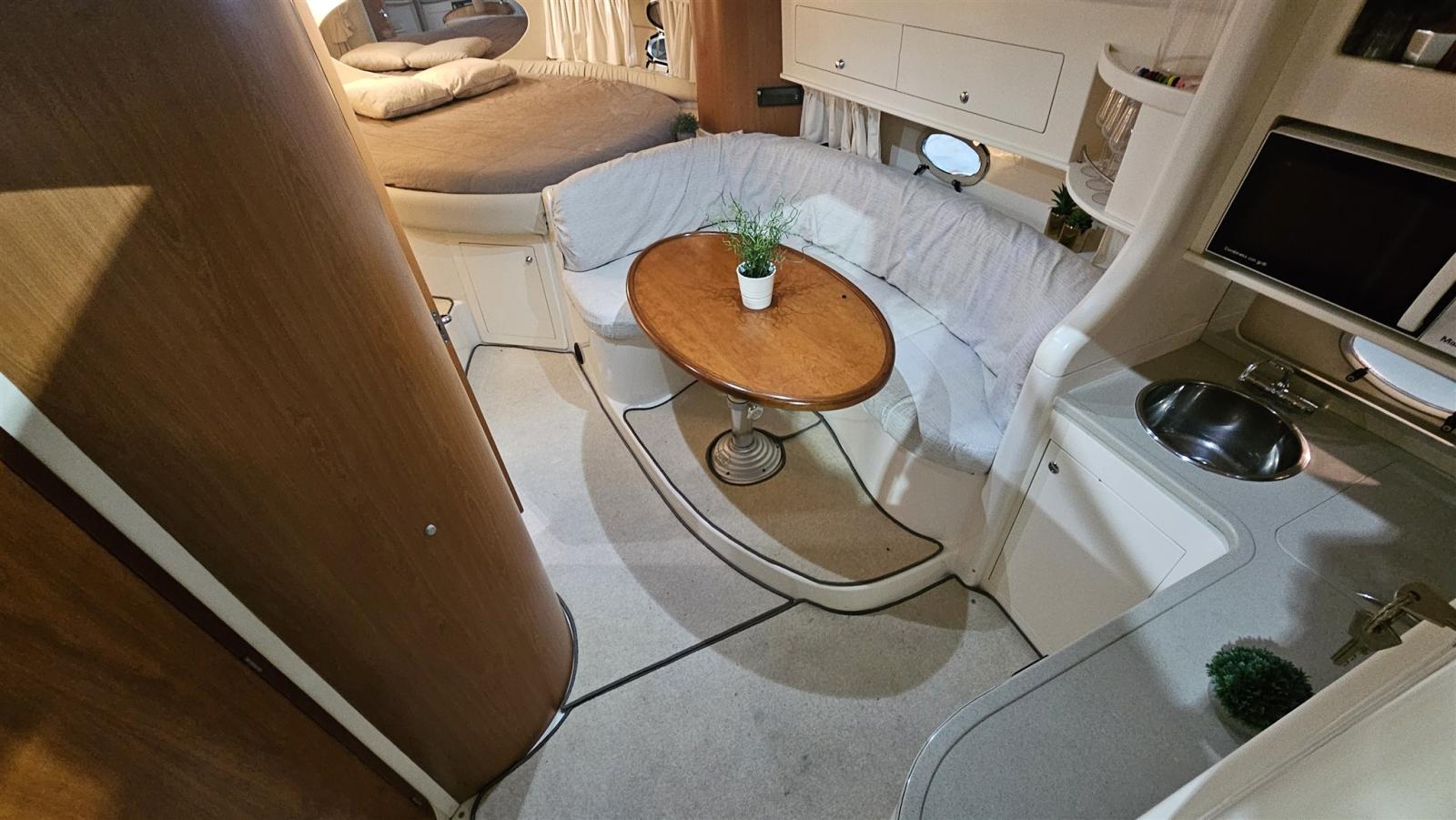Une atmosphère de bien-être déjà ressentie dans le cockpit avec des canapés doubles, une table et un mini-bar, se poursuit dans la salle à manger avec cuisine équipée et culmine par la vue sur le grand lit à la proue.