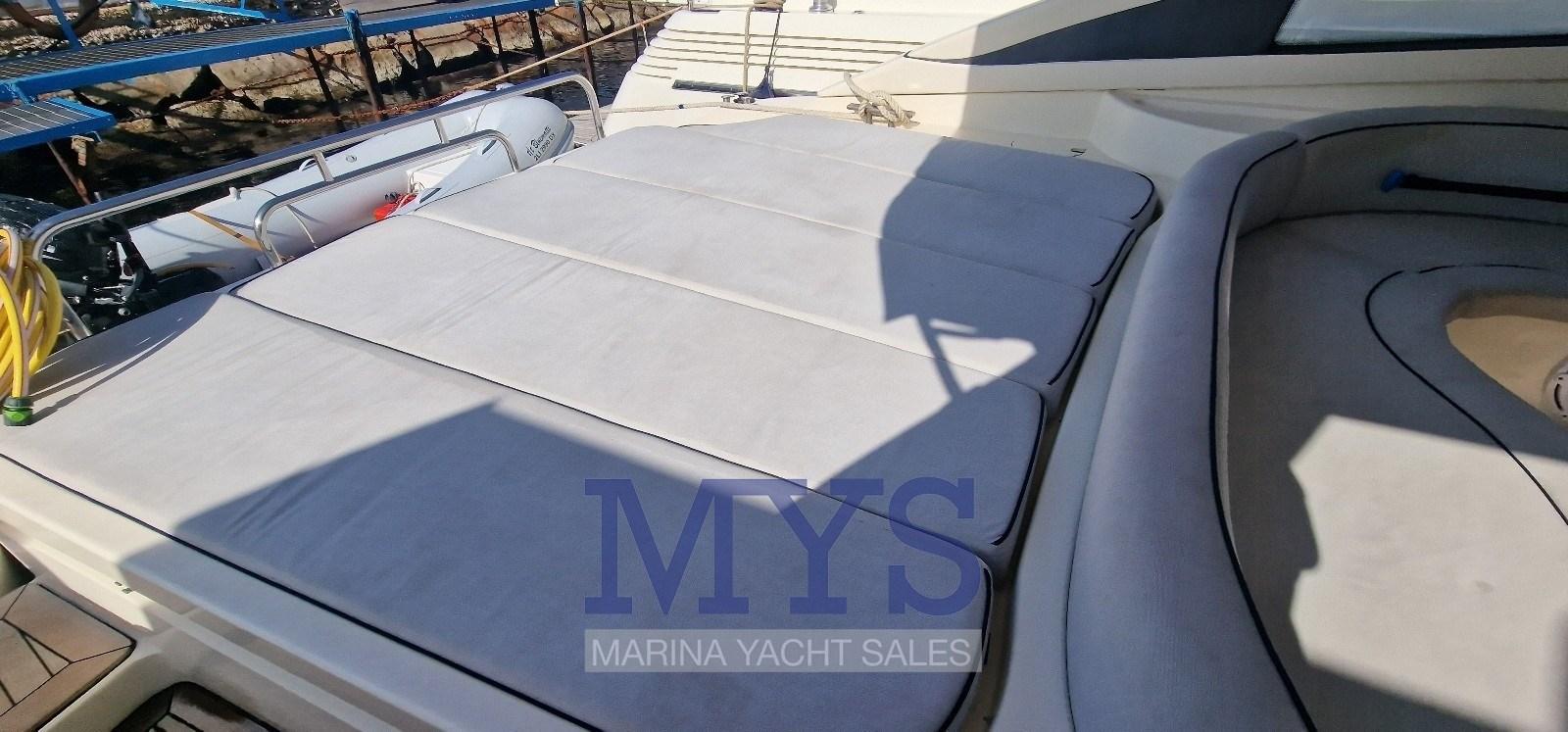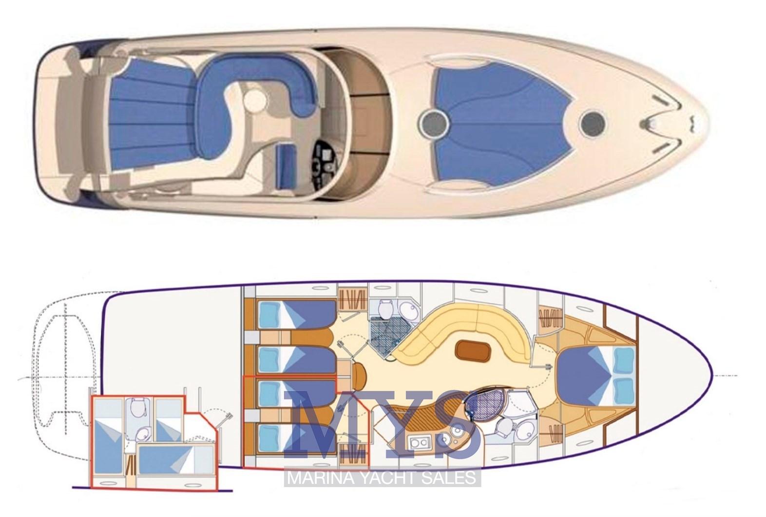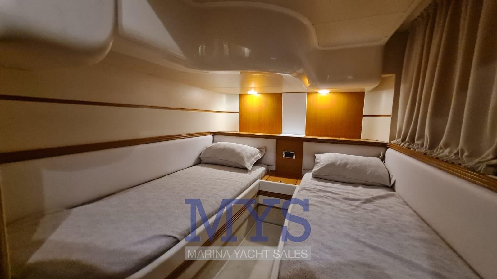 À l’avant du grand salon se trouve la cabine du propriétaire avec salle de bain privée. Vers la poupe, il y a les 2 cabines d’invités et un deuxième toilette. Poste de barre : à tribord du cockpit, desservi par un canapé 2 places. Pont ergonomique avec instrumentation moteur, radiotéléphone VHF, traceur avec GPS, échosondeur, compas, pilote automatique avec interface GPS Zone des cartes : sur les tables dans le cockpit et dans le salon intérieur Zone de la cuisine : située dans la zone centrale du bateau, à tribord. Éléments bas et hauts en bois précieux ; plaque de cuisson ; micro-ondes; Armoire avec réfrigérateur/congélateur de 270 litres.