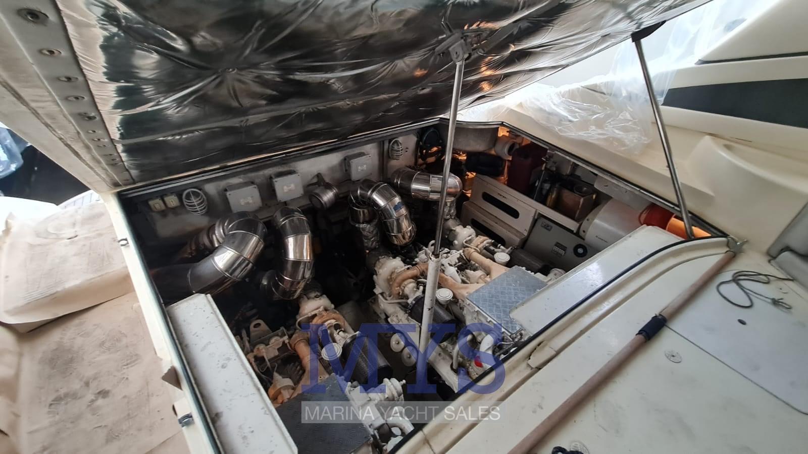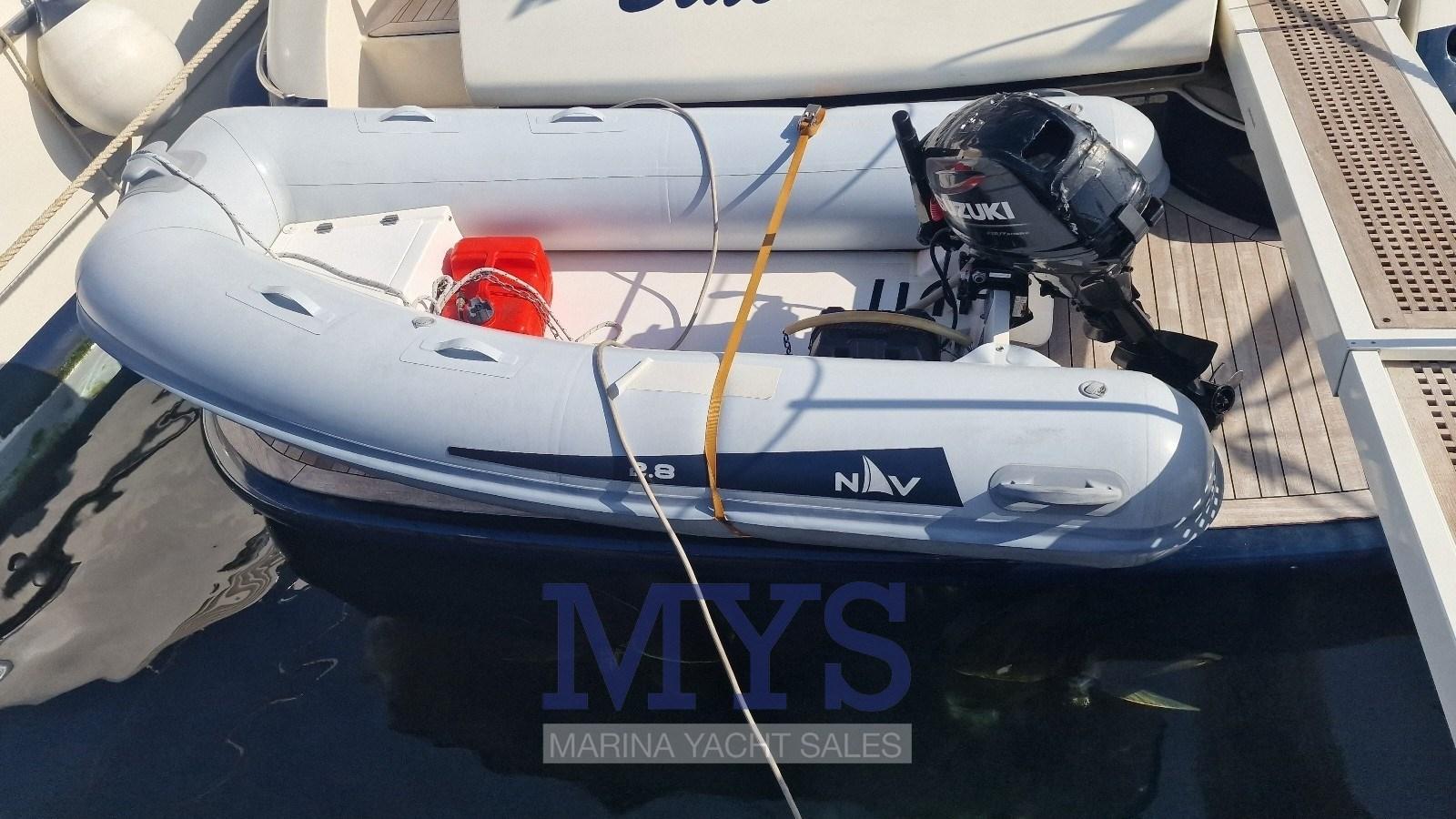 Alarme gaz, Alarme moteur, Alarme de pompe de cale, Ancre (Acciaio inox), Ouverture du compartiment moteur électrique, Eau sous pression, 8 Batteries, Douche de cockpit, Flaps hydrauliques, Bossoirs pour annexe, Extincteur(s) fixe(s), Indicateurs de flaps, Lavabo dans le cockpit, Éclairage de courtoisie, Passerelle (a scomparsa), Plateforme arrière (in teak), Pompe de cale manuelle, Cockpit en teck, Prise de quai, Connexion eau sous pression à quai, Onduleur, Guindeau électrique, Echelle de bain, table de cockpit, Annexe (2.80), Corne, 2 Winch électrique arrière, Winch électrique avant.