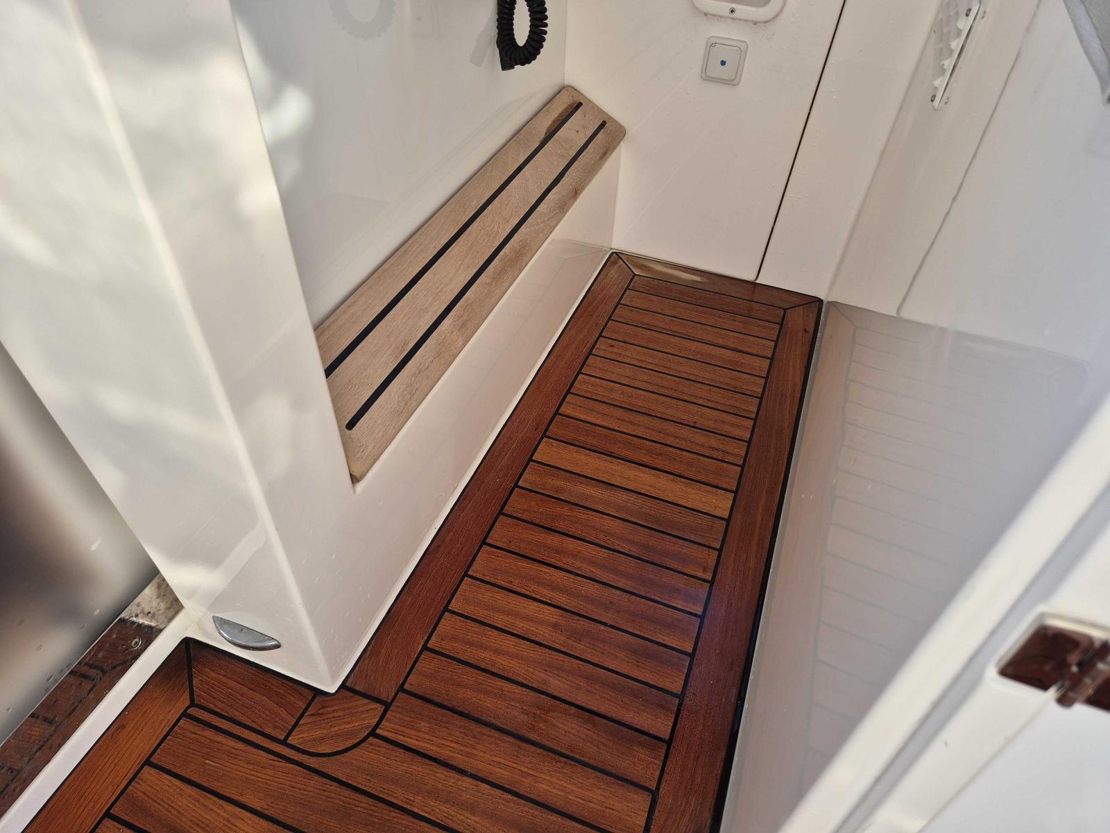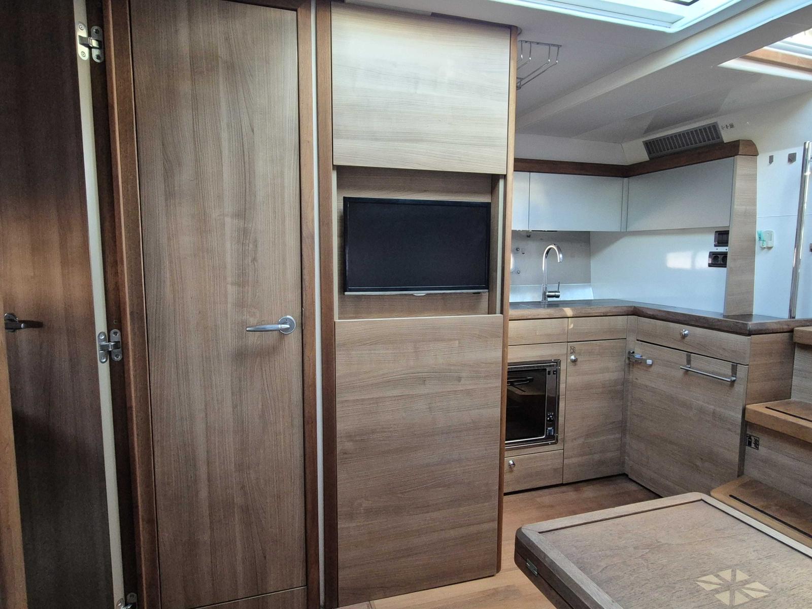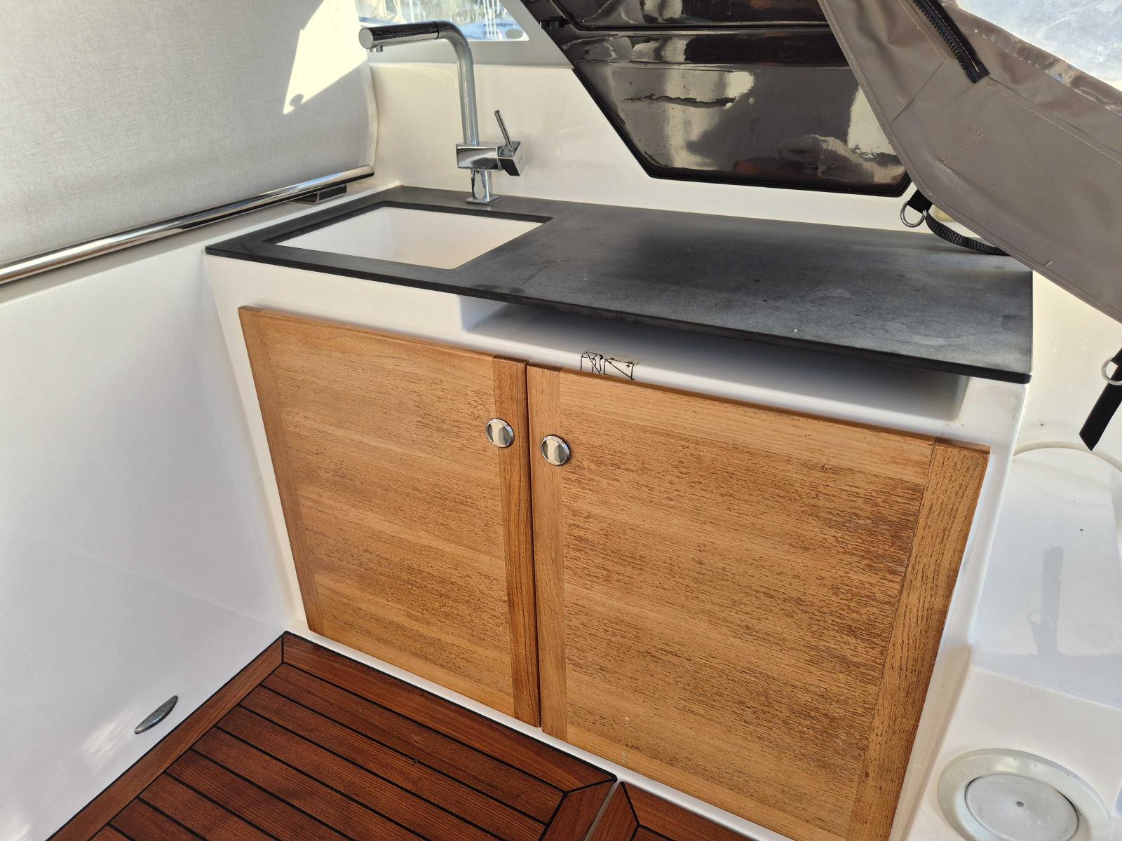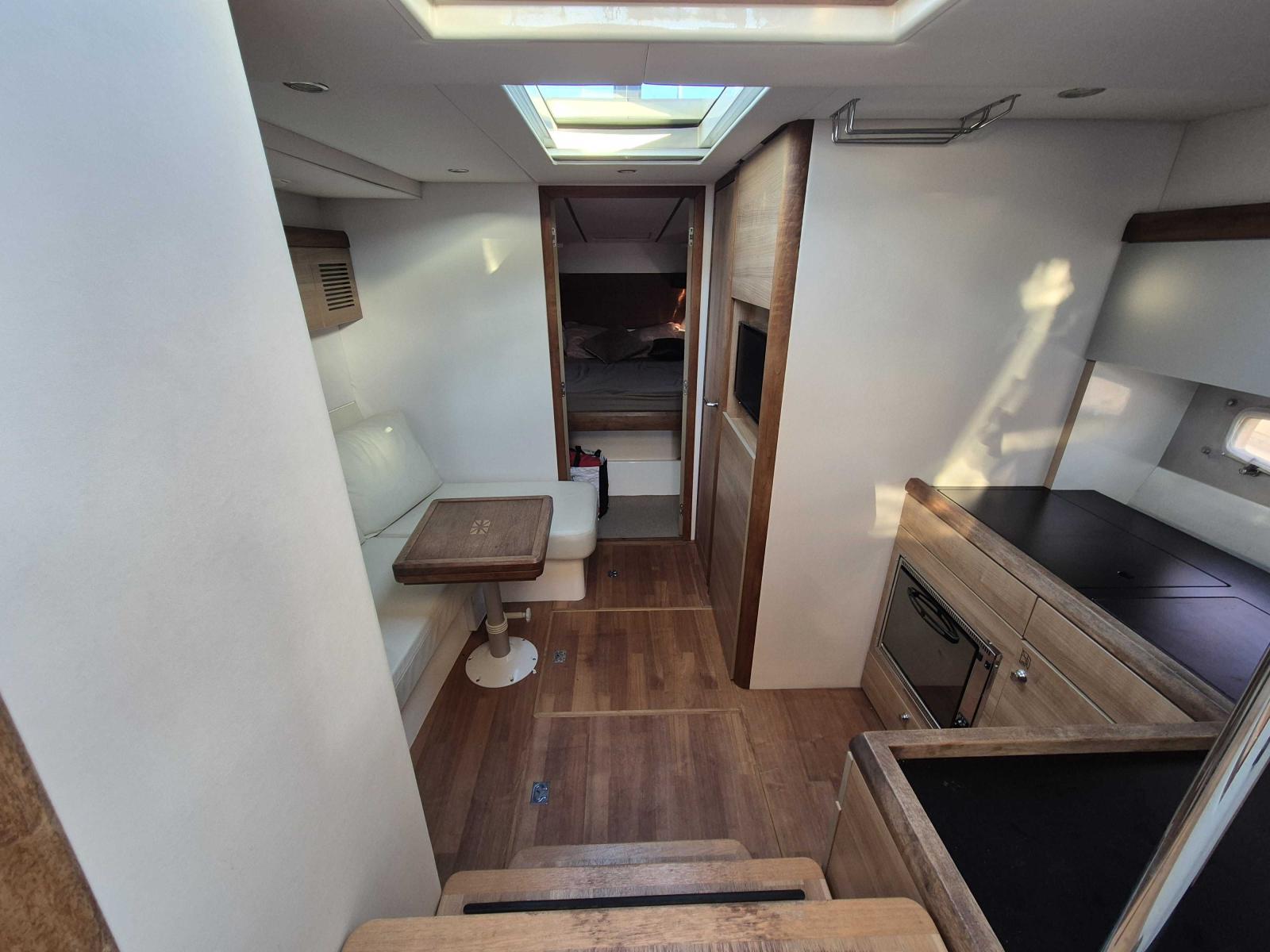 À l’intérieur, le bateau offre un niveau de finition remarquable : matériaux nobles, mobilier raffiné et agencement optimisé. On y retrouve deux cabines spacieuses, une cuisine entièrement équipée, une salle d’eau fonctionnelle et un salon accueillant, idéal pour les croisières en famille ou entre amis.