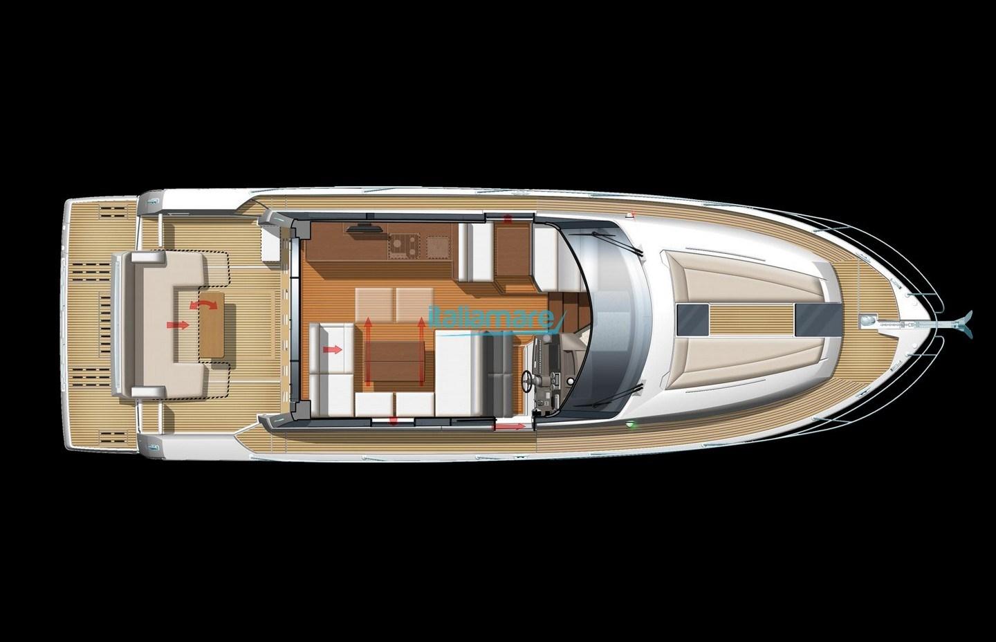 Elle adopte un design contemporain, mettant l’accent sur la luminosité et la fluidité des espaces. Le concept NC repose sur l’ouverture : le salon rejoint le cockpit pour créer un espace convivial unique grâce aux grandes portes coulissantes. En dessous du pont, il dispose de deux grandes cabines doubles et d’un salon décapotable, ainsi que de deux salles de bains complètes.