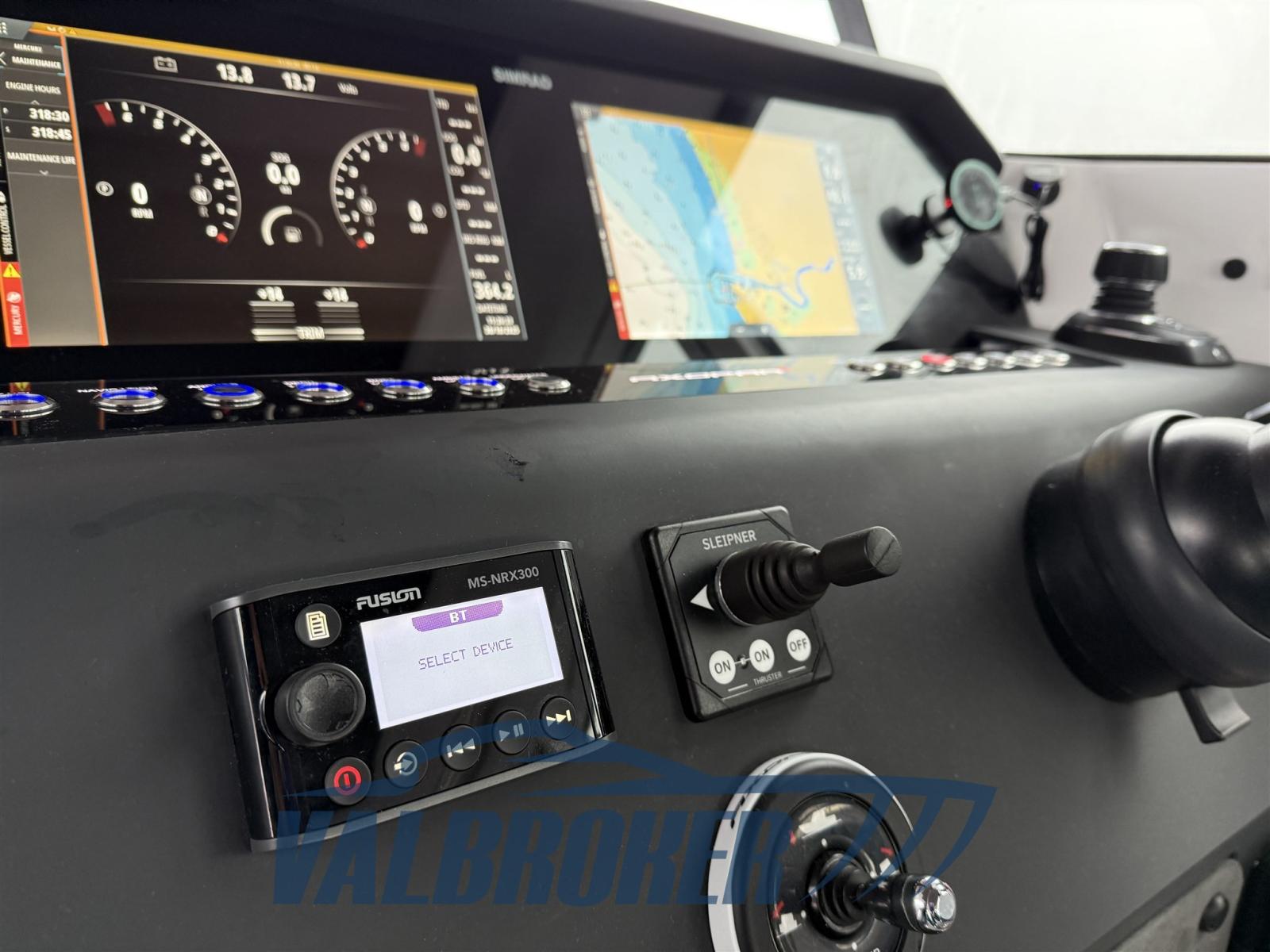 Eau sous pression, Douche de cockpit, Propulseur d'étrave (Sleipner), Phare de poursuite, Hard top (soft top scorrevole), Éclairage de courtoisie, Prise de quai.