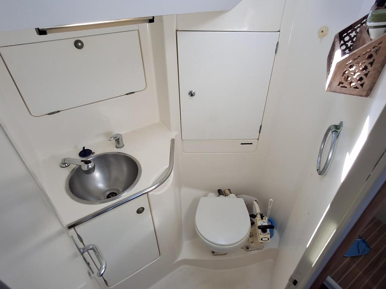 Une salle d’eau arrière-tribord avec douche, lavabo et WC