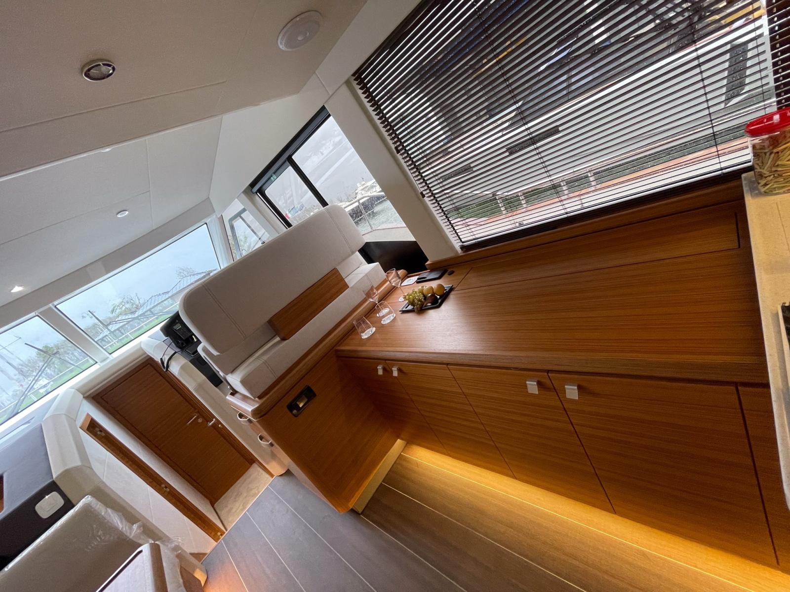 Couleur de la coque : Blanc pur (RAL 9010) + couleur de cabine Blanc pur (RAL 9010) - Disposition du salon : buffet incluant décodeur - Sellerie en tissu Rugana CRÈME - Sellerie en tissu Rugana GREY - Mobilier en teck doré avec détails en cuir blanc et moquette de sable, sol stratifié foncé - Pack électrique Greenline : 2 panneaux photovoltaïques dans le deckhouse, environ 280 W chacun, 3 x batteries de service Victron LiFePo 160Ah (5,76 kW), chargeur automatique onduleur 12V/5000VA/120A (système embarqué permanent 230V), système de contrôle Greenline App