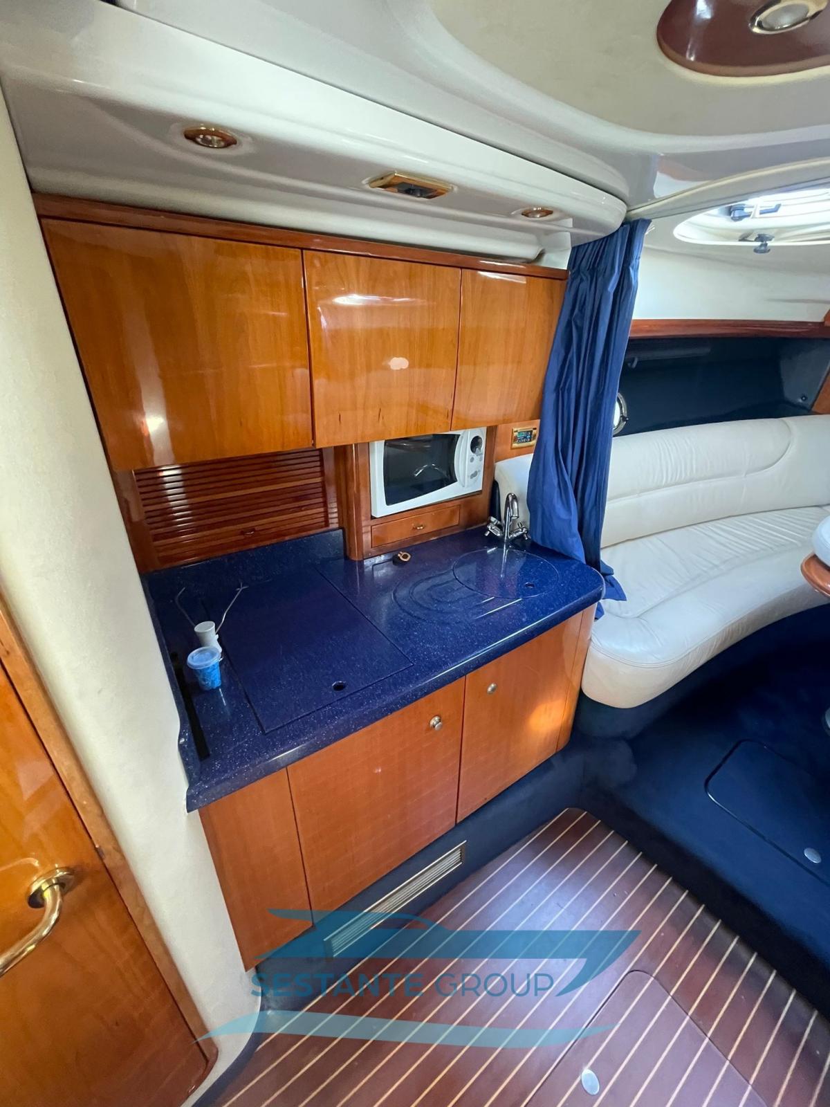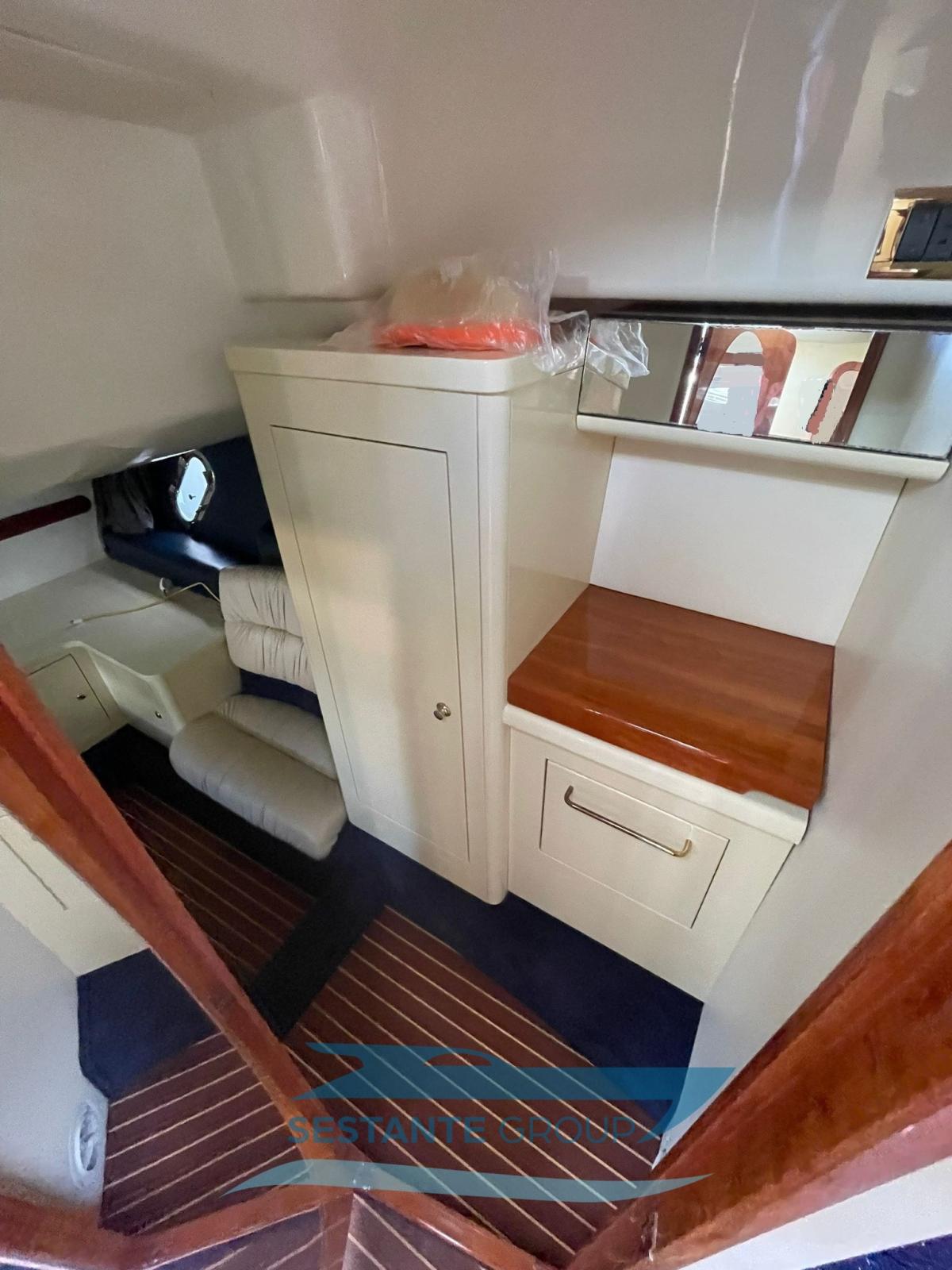 Le Cranchi 41 Endurance est le bateau compact idéal pour une croisière rapide en compagnie. De nombreuses caractéristiques le rendent particulièrement appréciable. Tout d’abord, l’espace à bord, à la fois sur le pont et en dessous, est très bien exploité : les zones de bain de soleil sont vastes à la proue comme à la poupe, et le cockpit est bien équipé et comprend une cuisine extérieure complète, un canapé semi-circulaire et une petite table, permettant de vivre pleinement la zone du bateau en contact direct avec la mer. À l’intérieur, cependant, la solution d’espace ouvert, comprenant une salle à manger et une double cabine, offre une grande aéréité. Une seconde cabine peut accueillir deux lits supplémentaires. Cet exemplaire est équipé de climatisation, de propulseur à proue, de plateforme arrière recouverte de teck et d’une passerelle hydraulique pour améliorer le confort et la praticité en toutes circonstances. Un