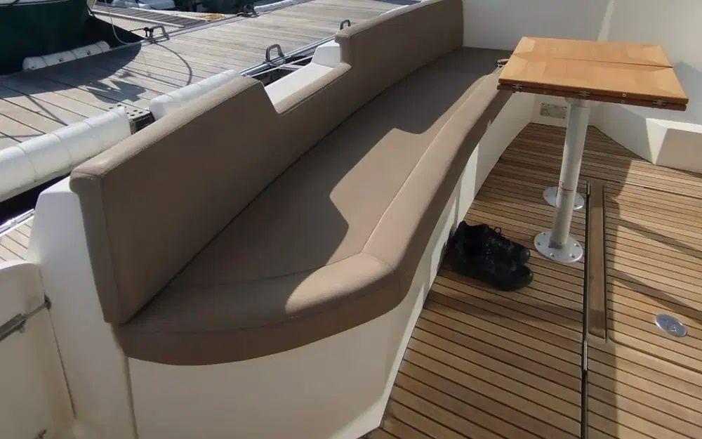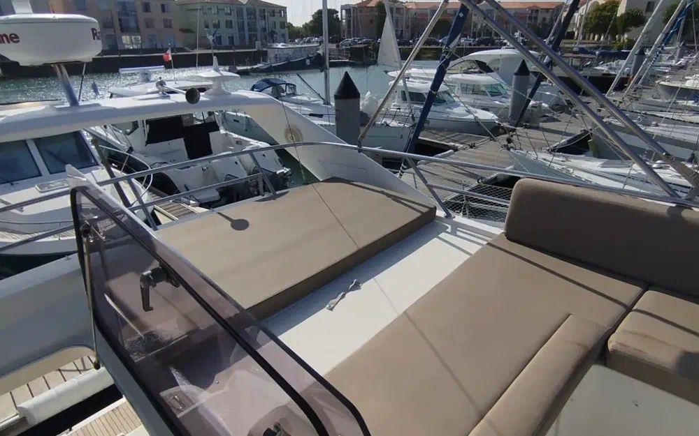 Le flybridge constitue un véritable espace de vie supplémentaire. Il permet de profiter pleinement de la navigation grâce à un poste de pilotage secondaire offrant une excellente visibilité. Les assises confortables, la table et le bain de soleil créent un espace idéal pour les moments de détente et les repas en extérieur, le tout protégé par un bimini.