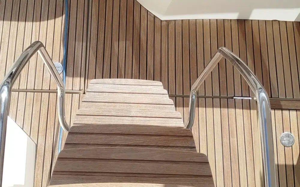 À l’arrière, la plateforme de bain avec échelle facilite l’accès à l’eau et rend les manœuvres plus pratiques au mouillage comme au port.