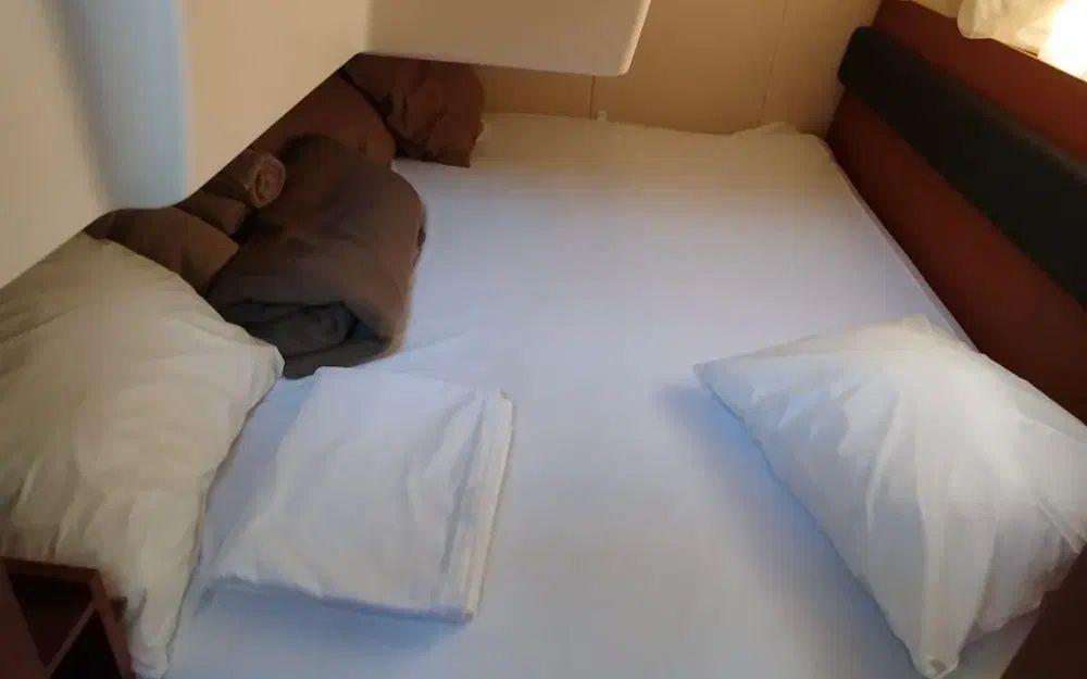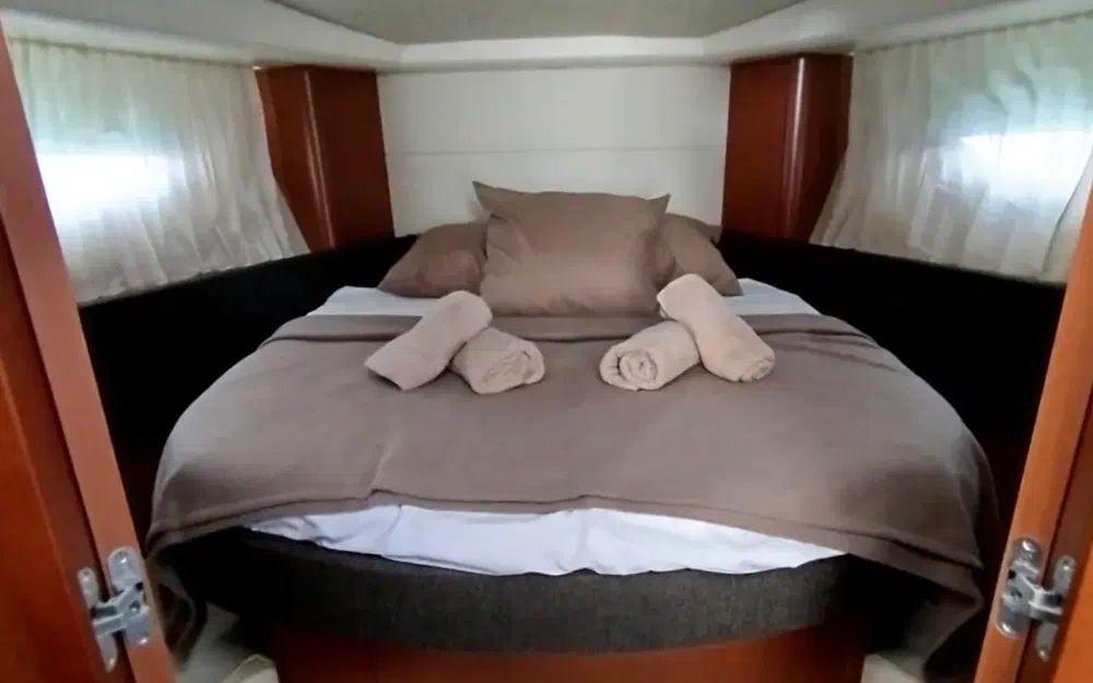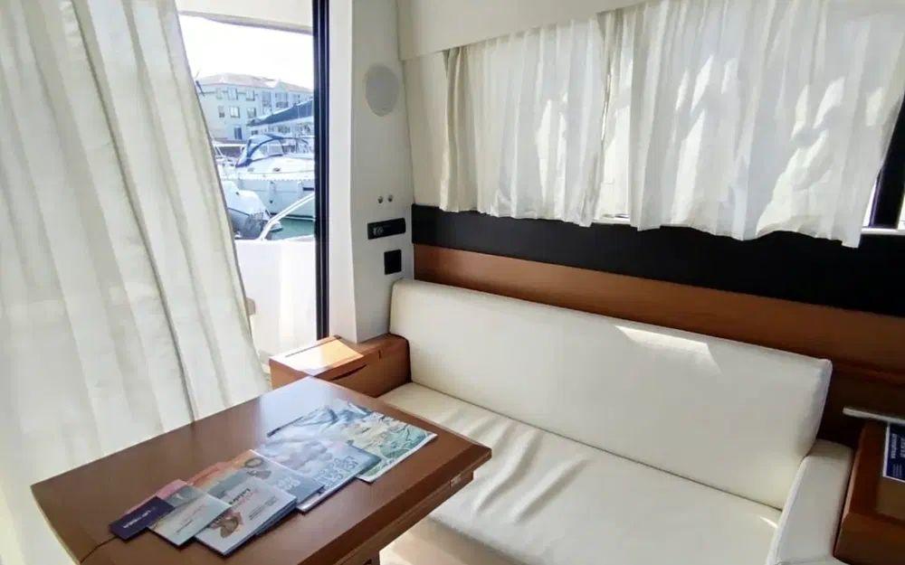 Dès l’entrée, le salon panoramique offre une atmosphère chaleureuse et lumineuse grâce à de larges vitrages donnant sur la mer. Le carré, convertible en couchage double, prolonge naturellement l’espace de vie et permet de recevoir confortablement.
