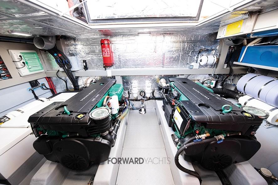 Moteur Volvo Penta 480 CV très peu d’heures de la moto et des accessoires précieux : propulseur d’étrave, climatisation dans chaque cabine, couvertures d’hiver complètes, ouverture du compartiment moteur électrique, passerelle hydraulique surdimensionnée et modifiée, dessalinisateur, groupe électrogène de 10 kW.