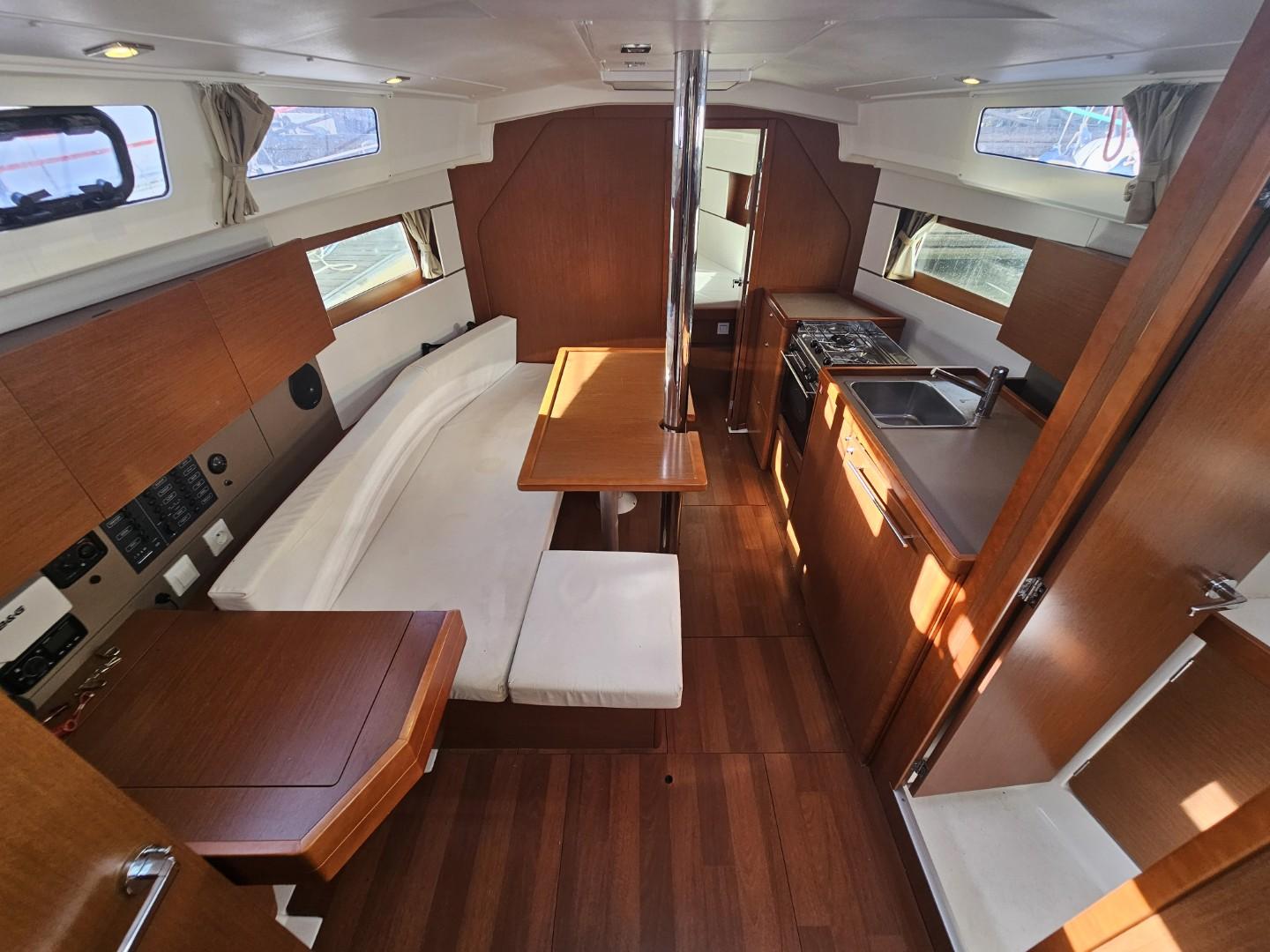L’aménagement intérieur de cet Océanis 35 en version 2 cabines privilégie l’espace et le confort. À l’arrière, une belle cabine propriétaire offre un couchage spacieux et lumineux avec de nombreux rangements. La cabine avant complète l’ensemble pour accueillir famille ou invités. Le carré convivial et la cuisine en L fonctionnelle créent un espace de vie agréable et chaleureux. Le chauffage Webasto assure un confort optimal en toutes saisons.