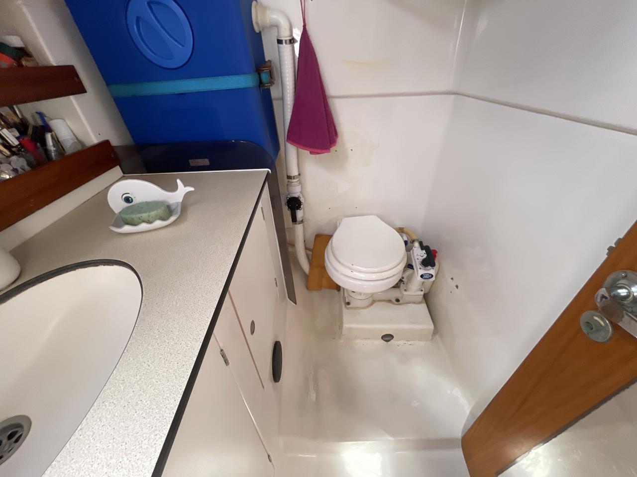 Salle d’eau sur l’arrière-tribord, WC avec cuve à eau noir, évier et bac à douche