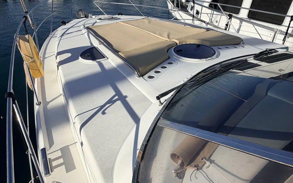 Coque en bon état de présentation, gelcoat sain et sans désordre structurel connu.Œuvres vives et mortes entretenues régulièrement.Pont spacieux et sécurisé, offrant une circulation fluide à bord.Bains de soleil avant et arrière permettant un excellent confort au mouillage.Ensemble extérieur soigné et conforme à l’âge de l’unité.