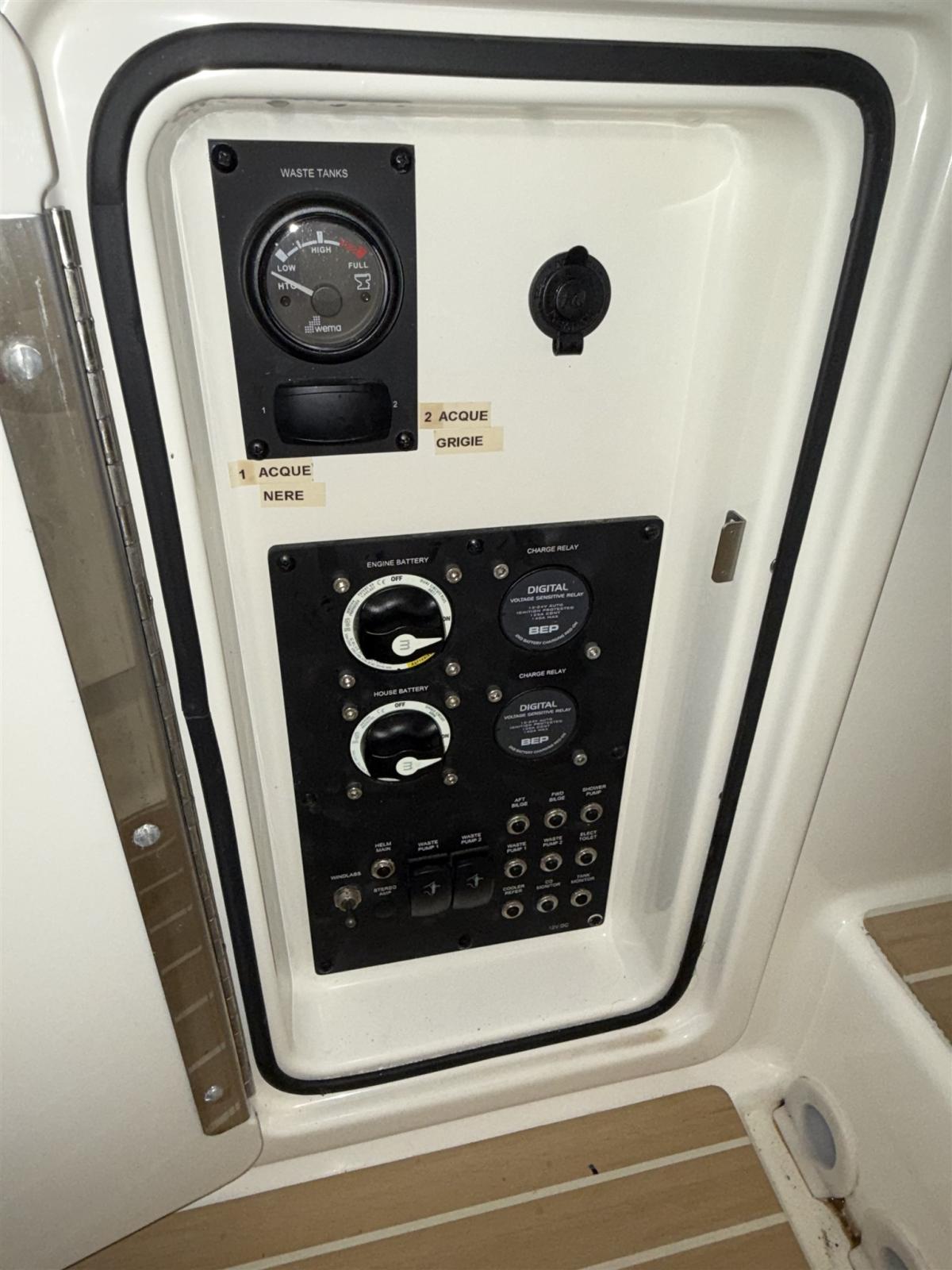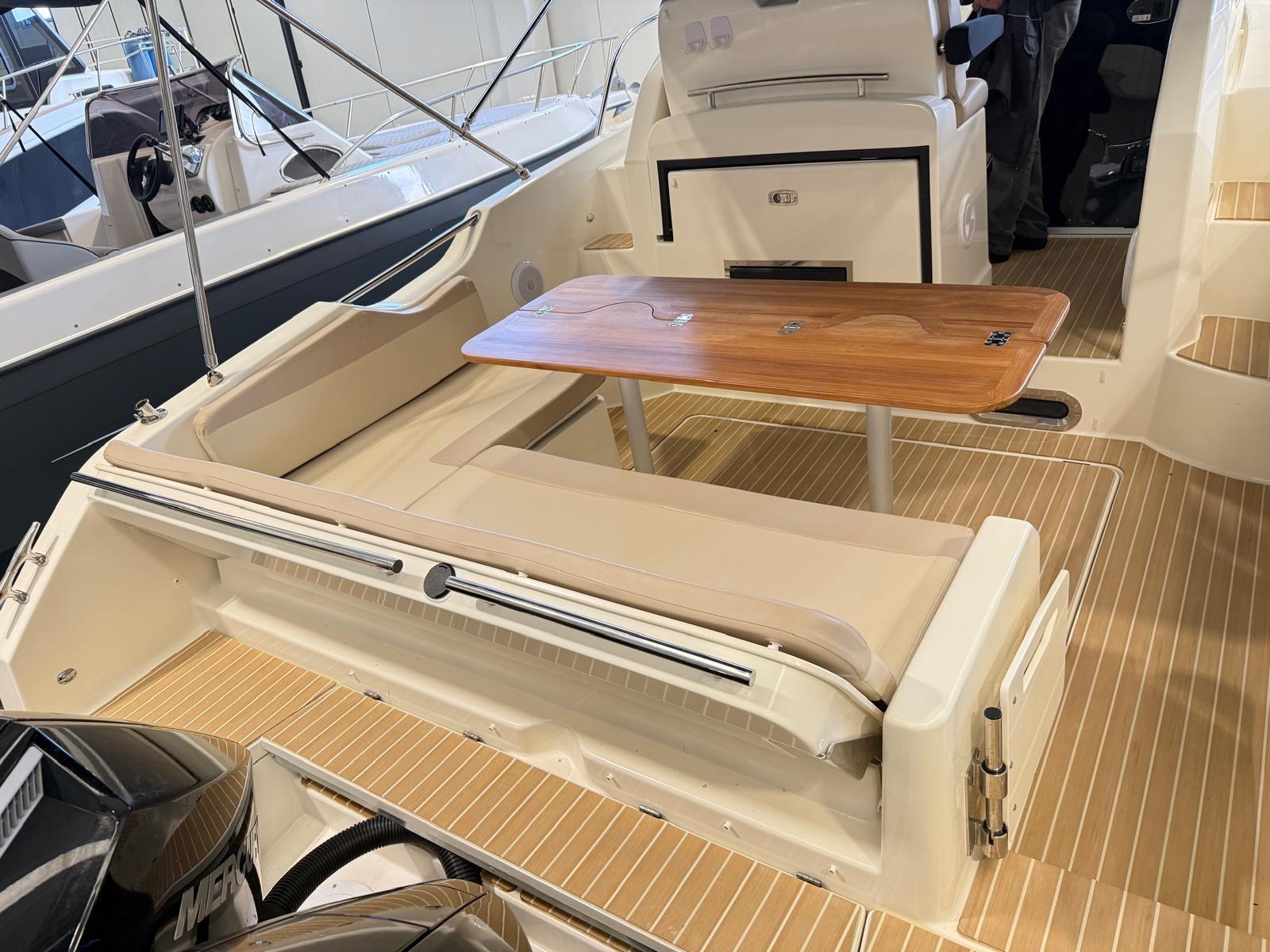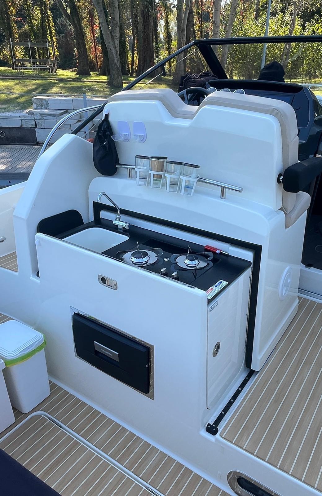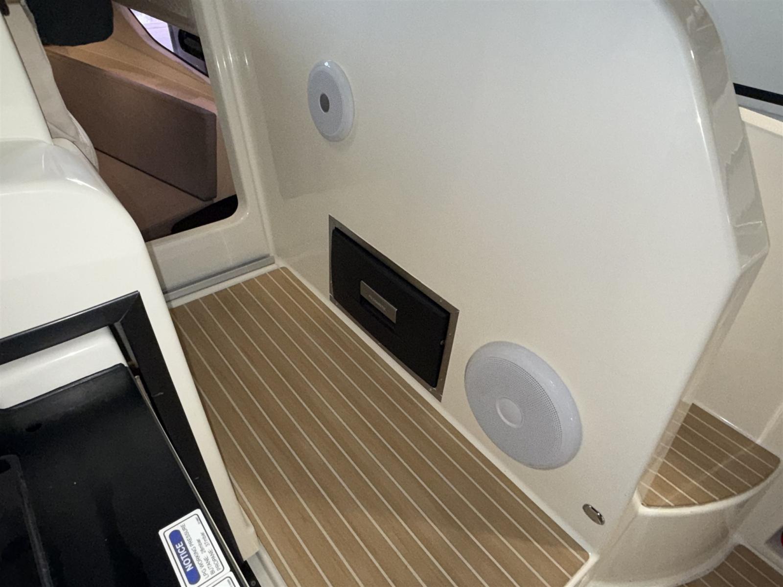Alarme moteur, Eau sous pression, Câble d’alimentation à quai, Douche de cockpit, Flaps électriques, Indicateurs de flaps, Lavabo dans le cockpit, Éclairage de courtoisie, Défenses, Cockpit en teck (Flexiteek), Prise de quai, Connexion eau sous pression à quai, Guindeau électrique, Echelle de bain, table de cockpit, Corne.