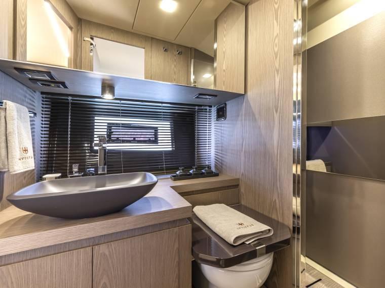 Longueur 14,27 m, carène marine stable et sécurisante, finitions premium et espaces extérieurs généreux.
