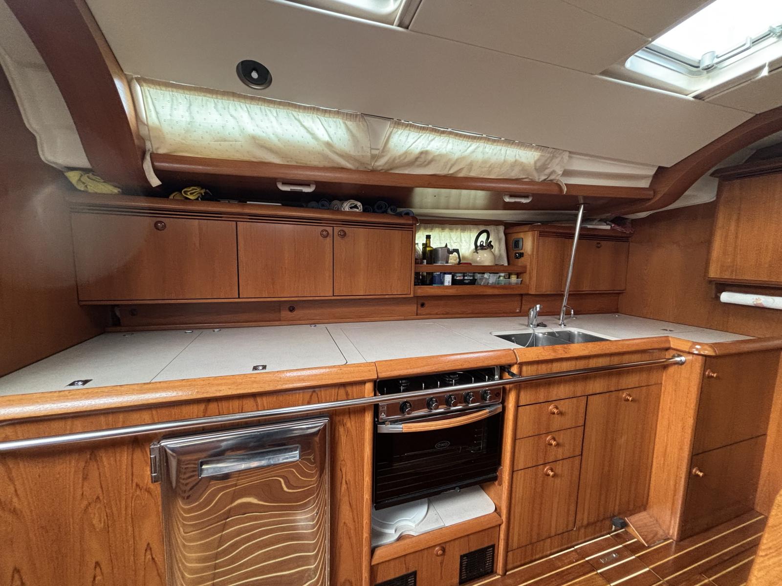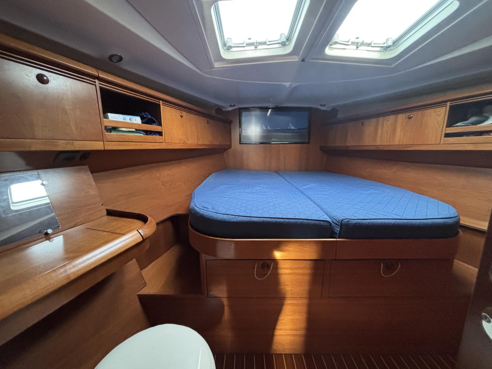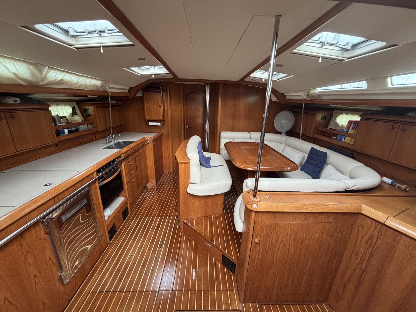 À l’intérieur, le Sun Odyssey 49 séduit par son ambiance lumineuse, ses boiseries chaleureuses et ses espaces de vie généreux. Le carré est vaste et convivial, la cuisine entièrement équipée, et les trois cabines offrent un excellent confort avec de nombreux rangements. Idéal pour la vie à bord et les croisières prolongées, le bateau dispose d’une grande autonomie grâce à son générateur, dessalinisateur, convertisseur et panneaux photovoltaïques.