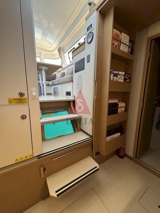 Cuisine (doppio lavello con pompa a pedale acqua mare), 2 Réfrigérateur intérieur (Isoterm 130CT 12-24V da 130 Lt. - Isoterm CR90F CT da 90 Lt), Lave-vaisselle (Bosh Silence Plus), Lave-linge (Daewoo da 3 Kg), Four micro-ondes (Whirpool MWD121), 2 Plaque vitrocéramique (Bosh).