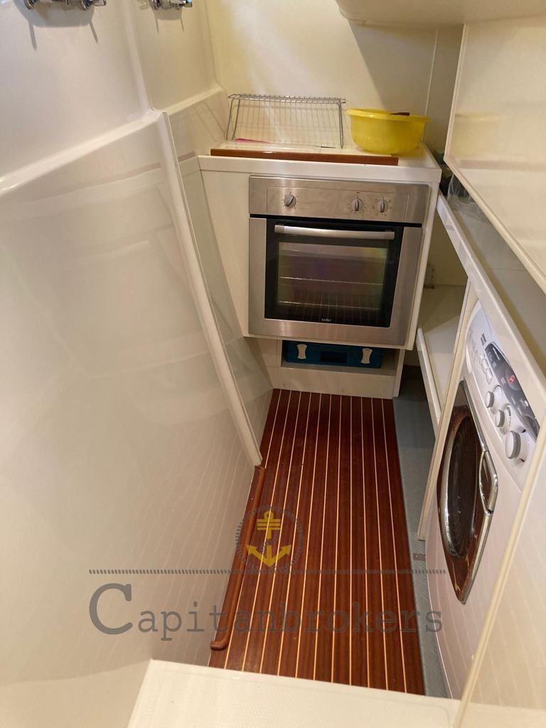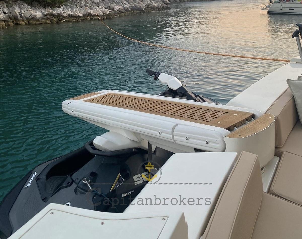 Alarme moteur, Alarme de pompe de cale, Eau sous pression, Spots sous-marins (led), Passerelle (estraibile), Plateforme arrière, Pompe de cale automatique, Pompe de cale manuelle, Porte latérale, Cockpit en teck, Prise de quai, Guindeau électrique, Echelle de bain (teak e acciaio), table de cockpit (teak con piedi in acciaio), Annexe (+ mt fb), Corne.