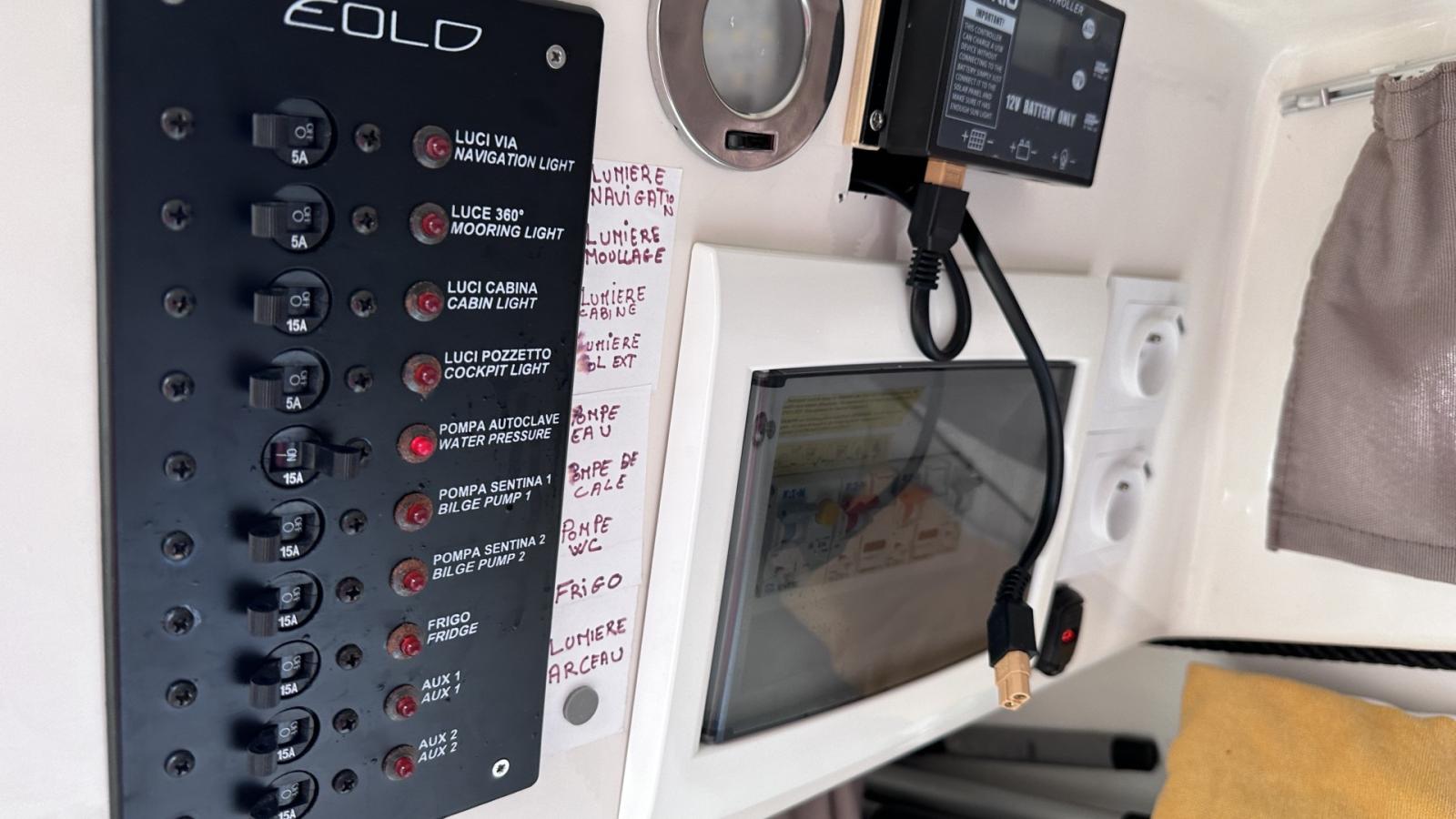 GPS et Sondeur GARMIN 92S, Guindeau électrique, Propulseur d’étrave, Flaps électriques automatiques, Prise de quai, Panneaux solaires souples sur bimini avec témoin de charge.