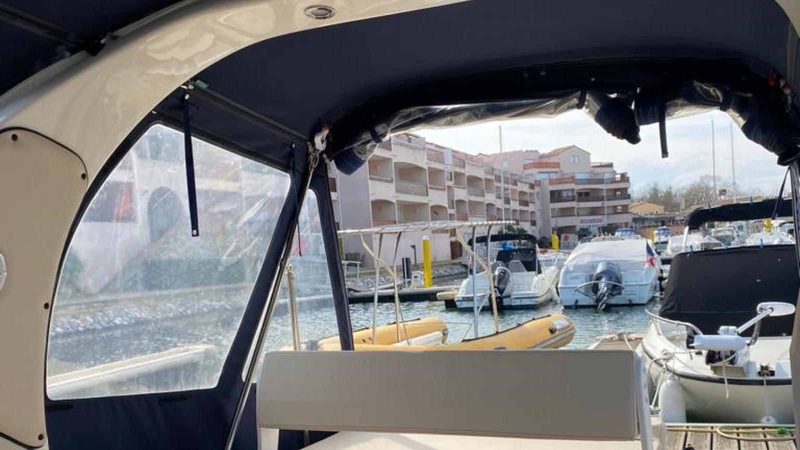 Cabine avant, Carré transformable, 2 couchettes doubles (4 couchages), Salle d’eau, Cockpit en Flexiteck, Plateforme de bain en Flexiteck, Table de cockpit, Réfrigérateur de cockpit, Bain de soleil avant, Bain de soleil arrière, Coussins de cockpit, Bimini, Taud de fermeture arrière complet bleu marine avec cristal.
