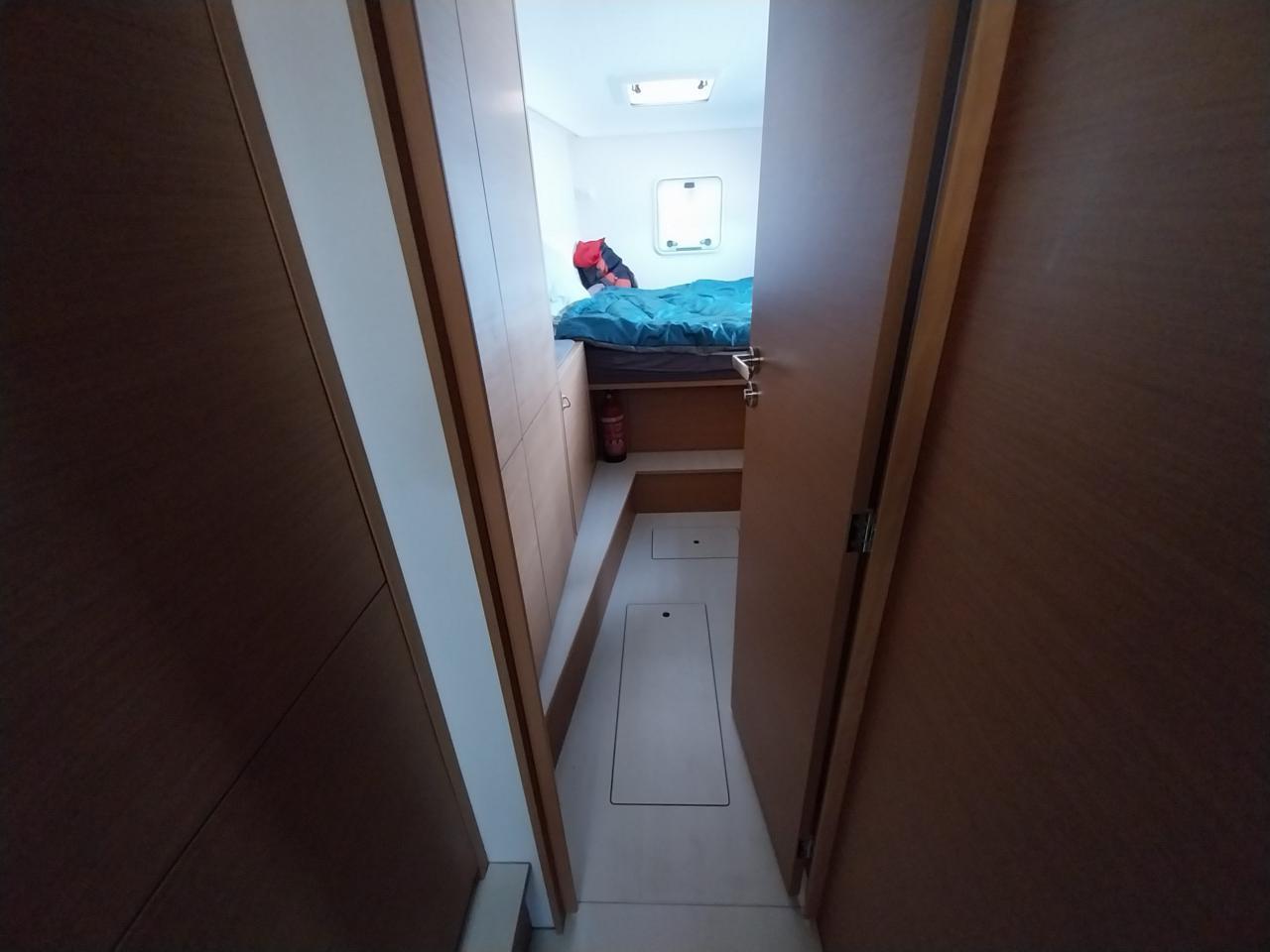 Une cabine double à l’avant avec penderie, coffre sous couchette et rangements