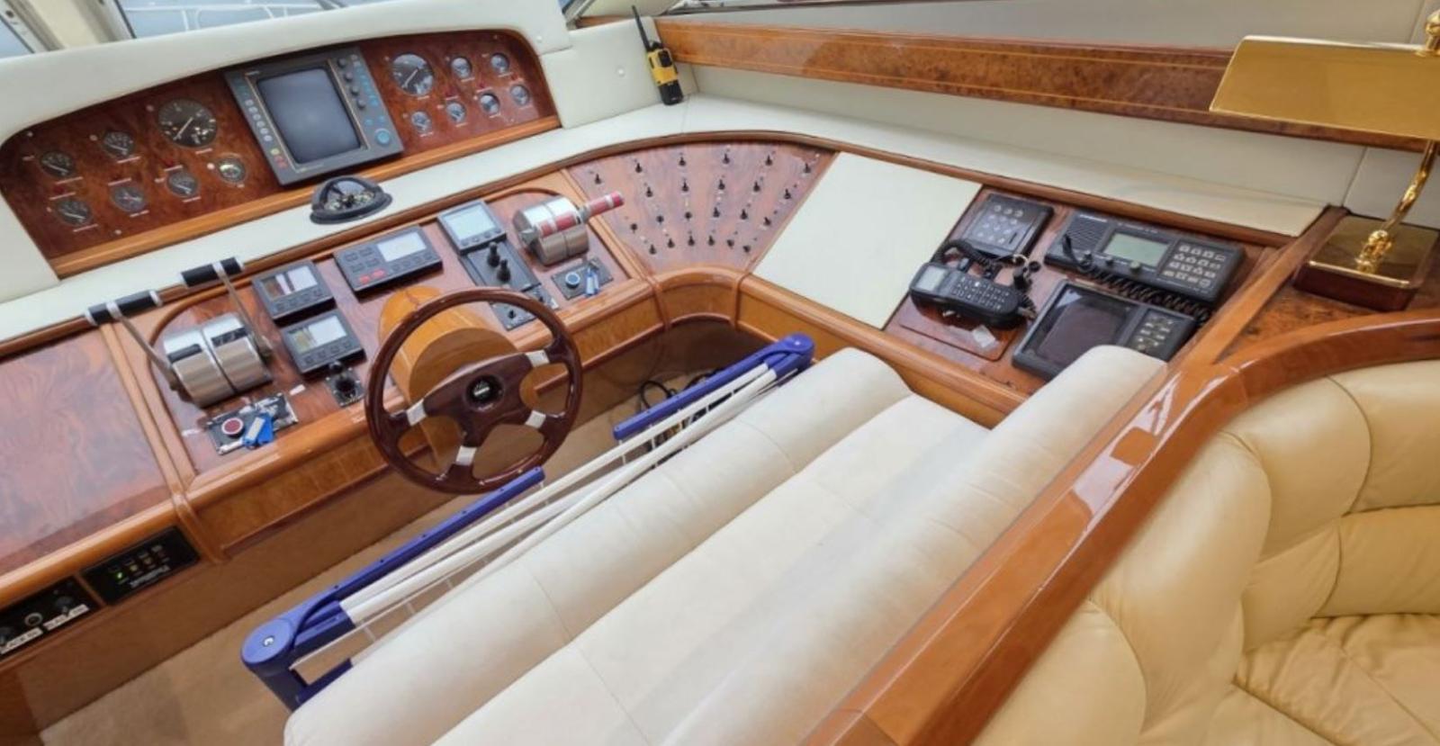 Alarme moteur, Eau sous pression, Douche de cockpit, Double barre à roue, Grue de flybridge, Passerelle, Porte latérale, Cockpit en teck, Prise de quai, Connexion eau sous pression à quai, Guindeau électrique, Echelle de bain, Winch électrique arrière.