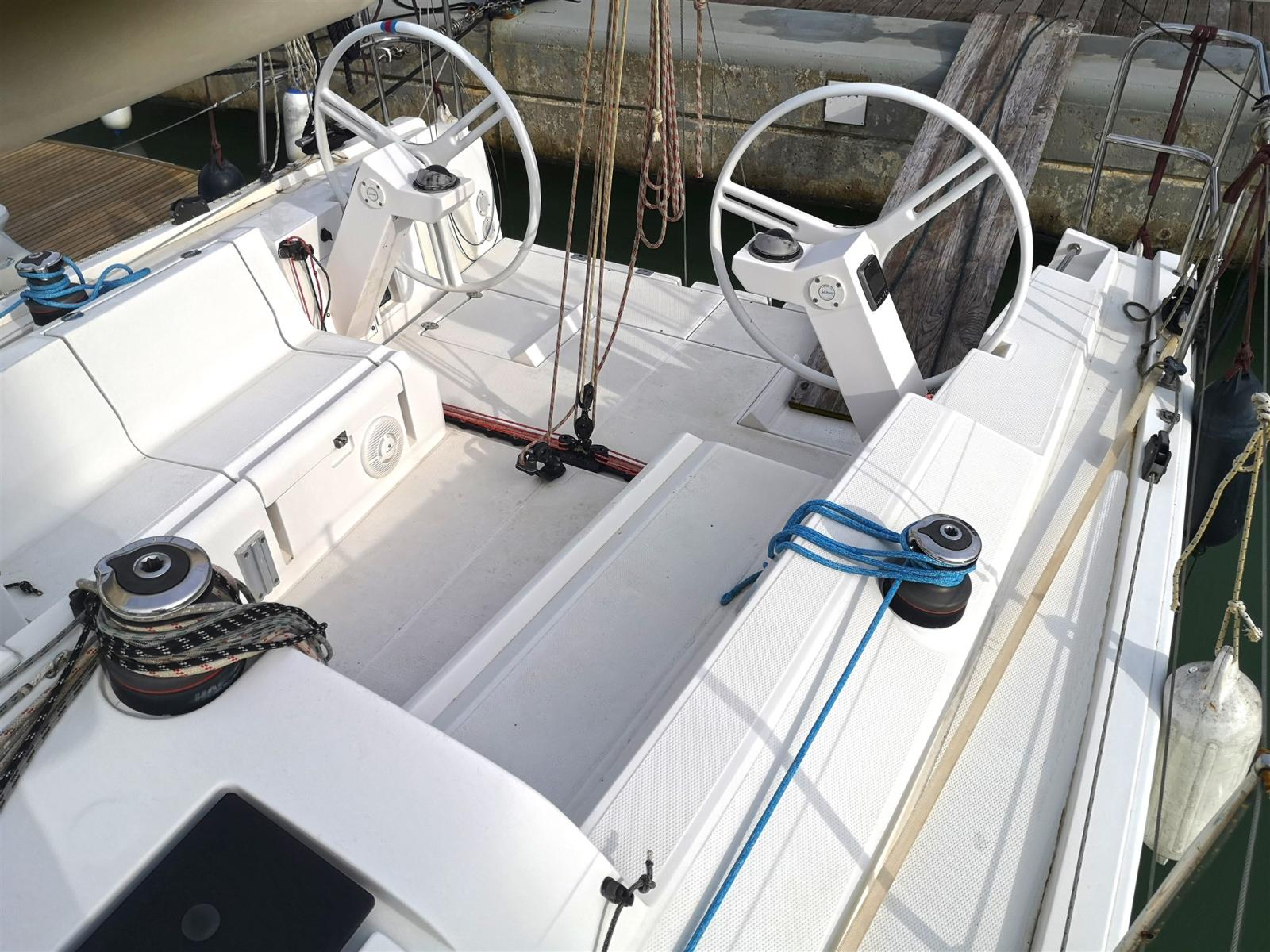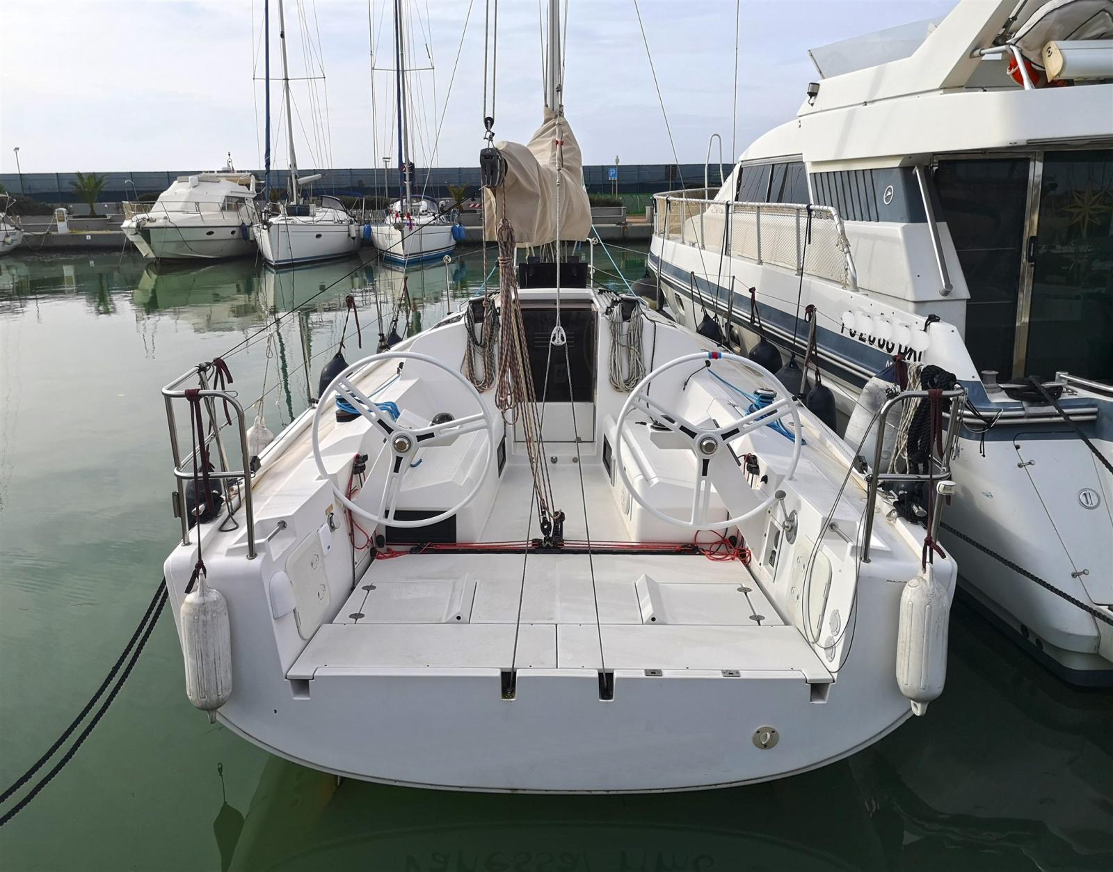 Bateau prêt à l’emploi avec double gouvernail et double jeu de voiles blanches.